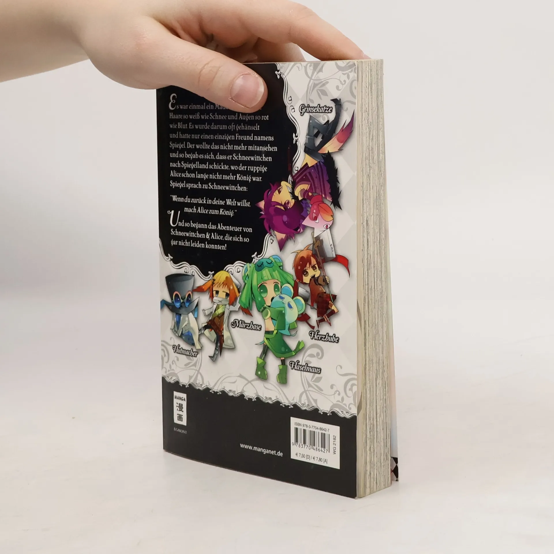 Es war einmal ein Mädchen, das hatte Haare so weiß wie Schnee und Augen so rot wie Blut… und es hasste Äpfel wie nichts sonst auf der Welt… Na, das ist ja mal ein komisches Schneewittchen! Und das landet unversehens in hinter den Spiegeln, wo der Junge Alice darum kämpft, wieder König zu werden. Nur ist Alice nicht so liebenswert, wie seine Untertanen denken, er ist eher ein miesgelaunter Bengel, der die geschenkten Kuchen der Dorfbewohner unangetastet wegwirft! Aber Schneewittchen muss ihn zum König machen, sonst kann sie nie mehr nach Hause. Die sexy Grinsekatze und mehr als verrückte Hutmacher sind da nicht besonders hilfreich, aber Schneewittchen wird Alice schon kleinkriegen!