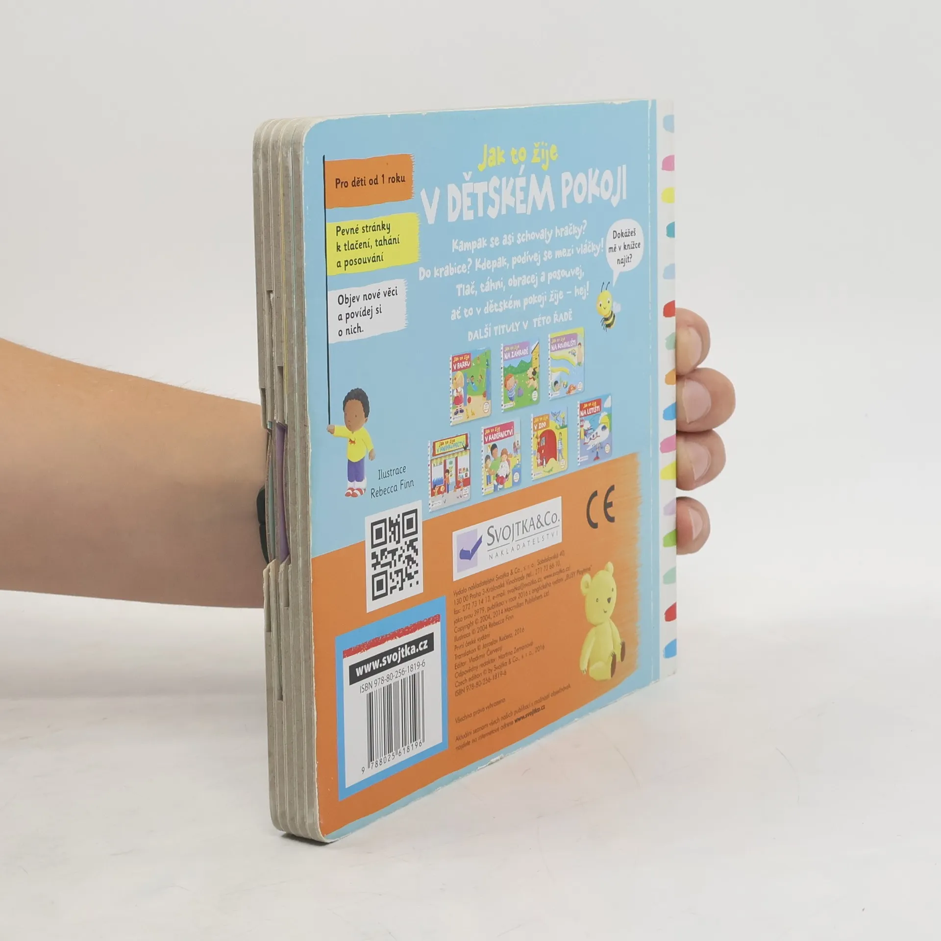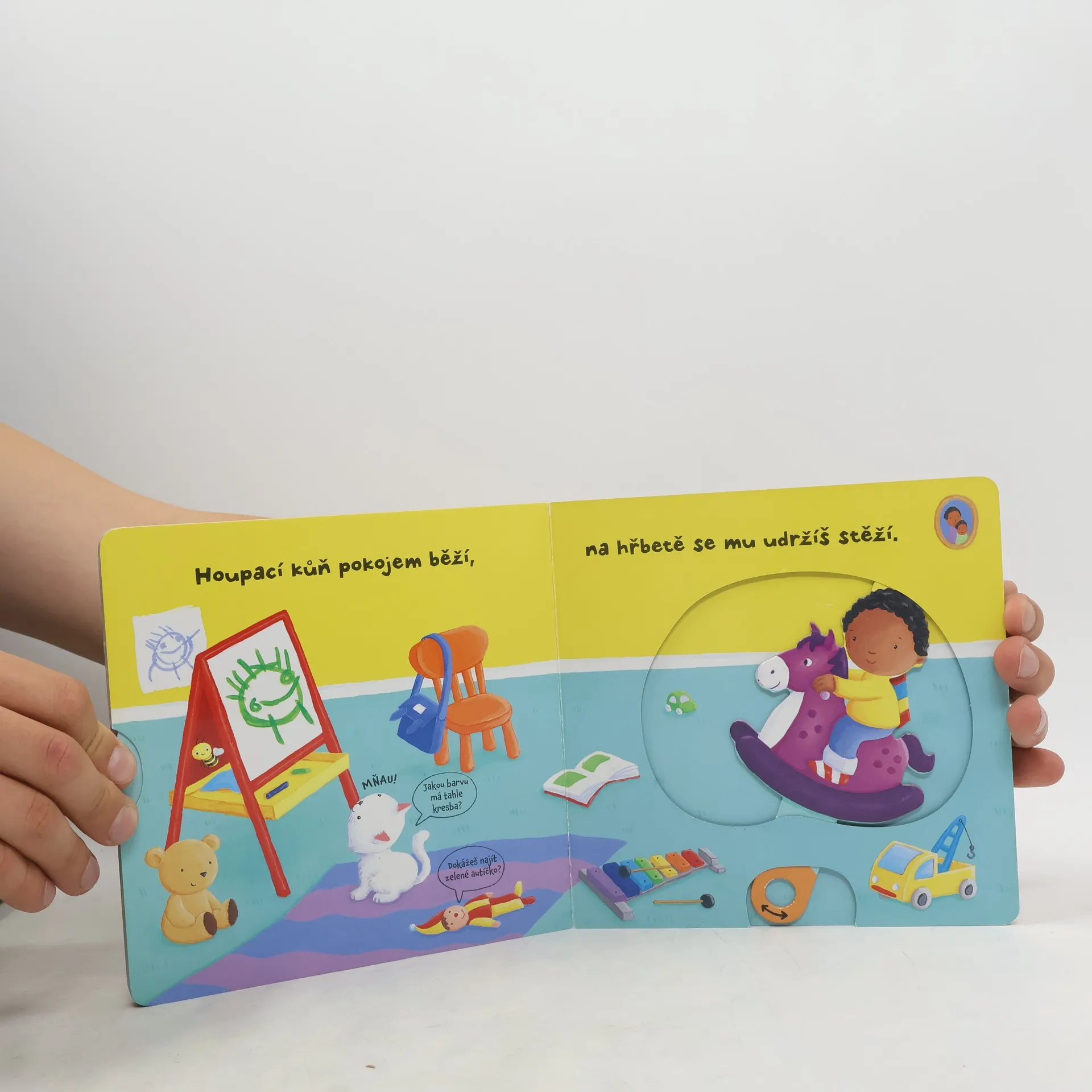 Leporelo je určeno pro děti od jednoho roku. Má pevné stránky s posuvnými a otočnými prvky. Zjisti, jak to žije v pokoji, a procvič si svou jemnou motoriku! Zajímá tě, jak to žije v dětském pokoji? Odsuň hračky a podívej se, kdo se za nimi schovává! Houpy, houpy, pohoupej kluka na koníkovi! Baf! Vyskoč s kašpárkem z krabice! Toto dětské leporelo je určeno pro děti od jednoho roku. Má pevné stránky s posuvnými a otočnými prvky, a tak si dítě při prohlížení knížky současně procvičí jemnou motoriku - může na jednotlivých stránkách posouvat, tahat, otáčet. Objeví nové věci a můžete si o nich společně povídat! Tak honem, všude kolem nás je plno překvapení!