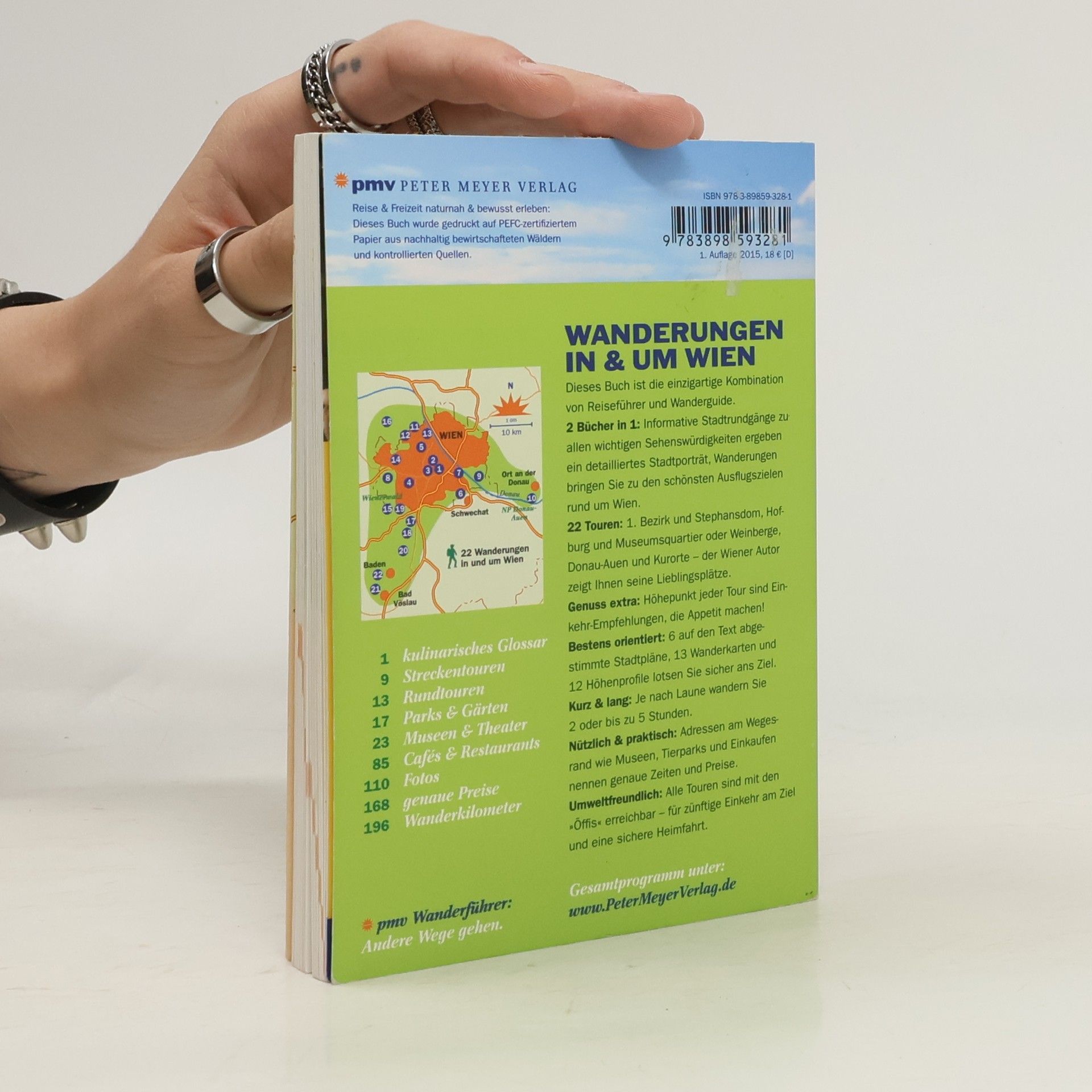 'Wanderungen in & um Wien' – das neue Buch aus dem Peter Meyer Verlag ist Wander- und Reiseführer in einem. Franz Wille führt seine Leser auf 6 Spaziergängen durch die Millionenstadt und auf 16 Wanderungen ins Umland. Er führt durch Wien und zeigt, dass der Prater mehr ist als nur Vergnügungspark. Spanische Hofreitschule, Beethoven- und Mozart-Wohnung oder die Kaisergemächer von Franz und Sisi werden geschichtenreich vorgestellt. Den Ring entlang geht es kulturell gespickt zum Museumsquartier, kulinarisch angereichert über den Naschmarkt oder in einen der Schanigärten. In der grünen Umgebung werden Donau-Auen und Wienerwald erwandert, über Weinberge geht es auf die Hausberge mit einmaligen Ausblicken auf die Stadt. Großzügige Fotos zeigen die Schönheit der Natur und machen Lust auf die Touren. Das Beste kommt dabei zum Schluss: Zu jeder Wanderung gibt es die besondere Einkehrempfehlung des Wiener Autors, die schon beim Lesen Appetit macht: Wiener Melange und Sachertorte im Kaffeehaus oder Schnitzel und Tafelspitz im Gasthaus. Zum Heurigen führt er dorthin, wo 'ausg‘steckt is'. Mit 2 – 5 Stunden sind alle Touren für spontane Ausflügler oder Kurzbesucher geeignet. Die genauen Wanderkarten, Höhenprofile sowie Tipps für An- und Rückreise mit öffentlichen Verkehrsmitteln sind ideal zum sofortigen Aufbrechen.
