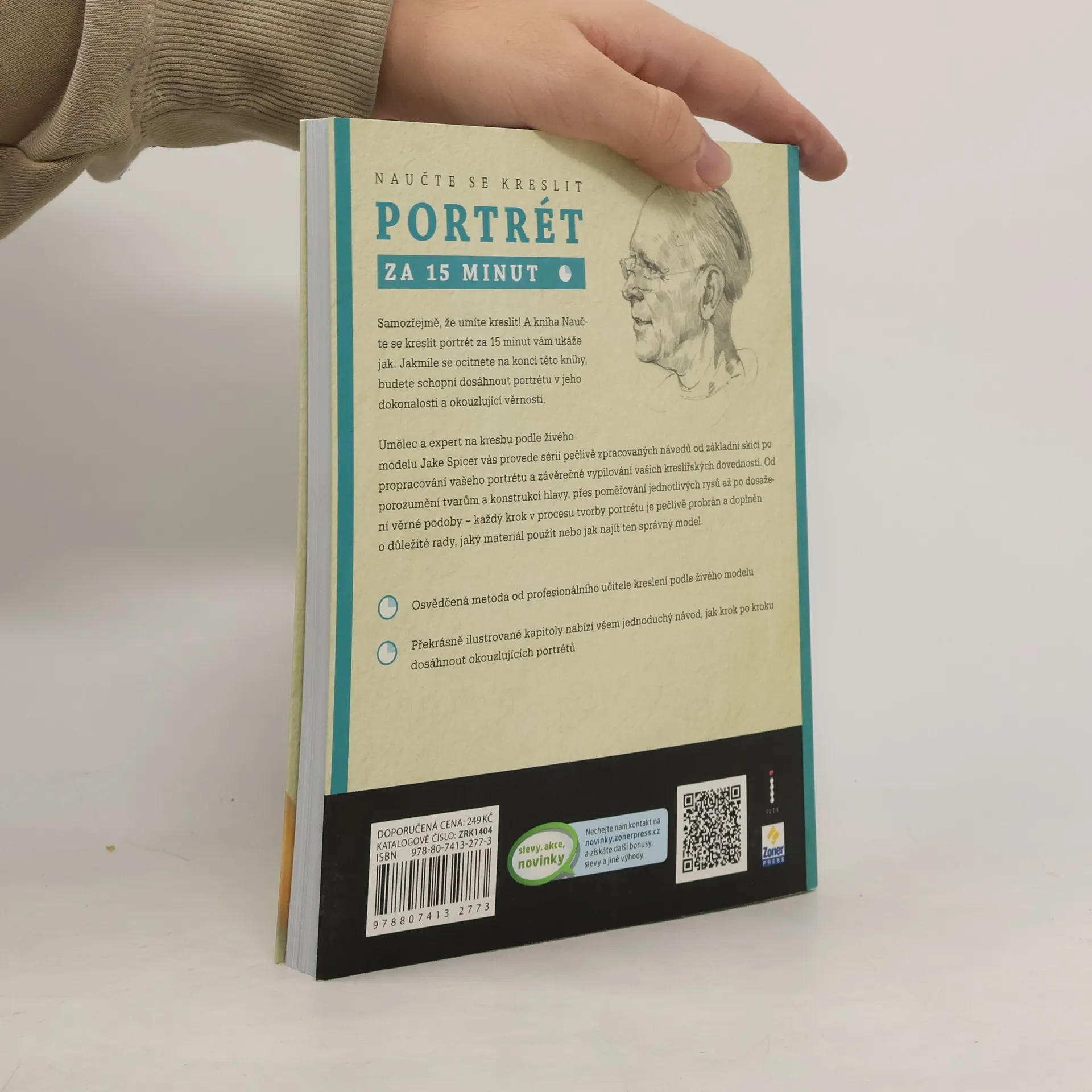 Zvládněte kresbu portrétů díky jedinečnému návodu od profesionálního kreslíře Jakea Spicera! Chtěli byste se naučit kreslit portréty, ale nevíte jak začít? Kreslíte a potřebujete vypilovat své výtvory k dokonalosti? Nebo vás kreslení prostě jen baví a hledáte stále nové způsoby a metody? Jednoduchá ale obsahově bohatá kniha od Jakea Spicera vám zajisté vyjde vstříc. V knize Naučte se kreslit portrét za 15 minut vám její autor nabízí přehledný návod, jak krok po kroku dosáhnout dokonalého portrétu. Seznámí vás s nejvhodnějšími pomůckami a technikami, poučí o teorii světla a stínu, vysvětlí, jak přistupovat k živému modelu a krom jiného vás naučí vykreslit všechny detaily tváře tak, aby byl váš výtvor jednoduše dokonalý.