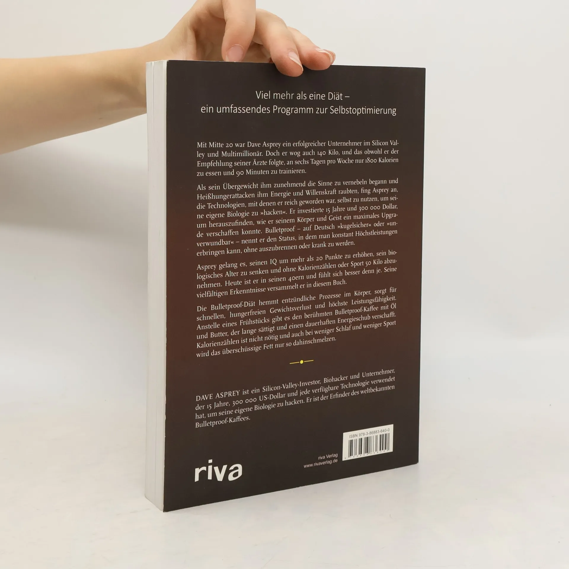 Mit Mitte 20 war Dave Asprey ein erfolgreicher Unternehmer im Silicon Valley und Multimillionär, wog jedoch 140 Kilo, trotz der Empfehlung seiner Ärzte, an sechs Tagen pro Woche nur 1800 Kalorien zu essen und 90 Minuten zu trainieren. Als sein Übergewicht seine Sinne trübte und Heißhungerattacken seine Energie raubten, begann er, die Technologien, die ihn reich gemacht hatten, zu nutzen, um seine Biologie zu „hacken“. Nach 15 Jahren und 300.000 Dollar in Tests und Selbstversuchen, einschließlich EEGs und einem Aufenthalt in einem tibetischen Kloster, suchte er nach Wegen, um Körper und Geist zu optimieren. Er nennt den Zustand, in dem man konstante Höchstleistung bringt, ohne auszubrennen, „Bulletproof“. Asprey steigerte seinen IQ um über 20 Punkte, senkte sein biologisches Alter und verlor 50 Kilo, ohne Kalorienzählen oder Sport. Seine Erkenntnisse sind in diesem Buch zusammengefasst. Die Bulletproof-Diät reduziert Entzündungen, fördert schnellen, hungerfreien Gewichtsverlust und steigert die Leistungsfähigkeit. Anstelle eines Frühstücks empfiehlt er Bulletproof-Kaffee mit Kokosöl und Butter, der lange sättigt und für anhaltende Energie sorgt. Kalorienzählen ist überflüssig, und auch mit weniger Schlaf und Sport schmilzt das überschüssige Fett.