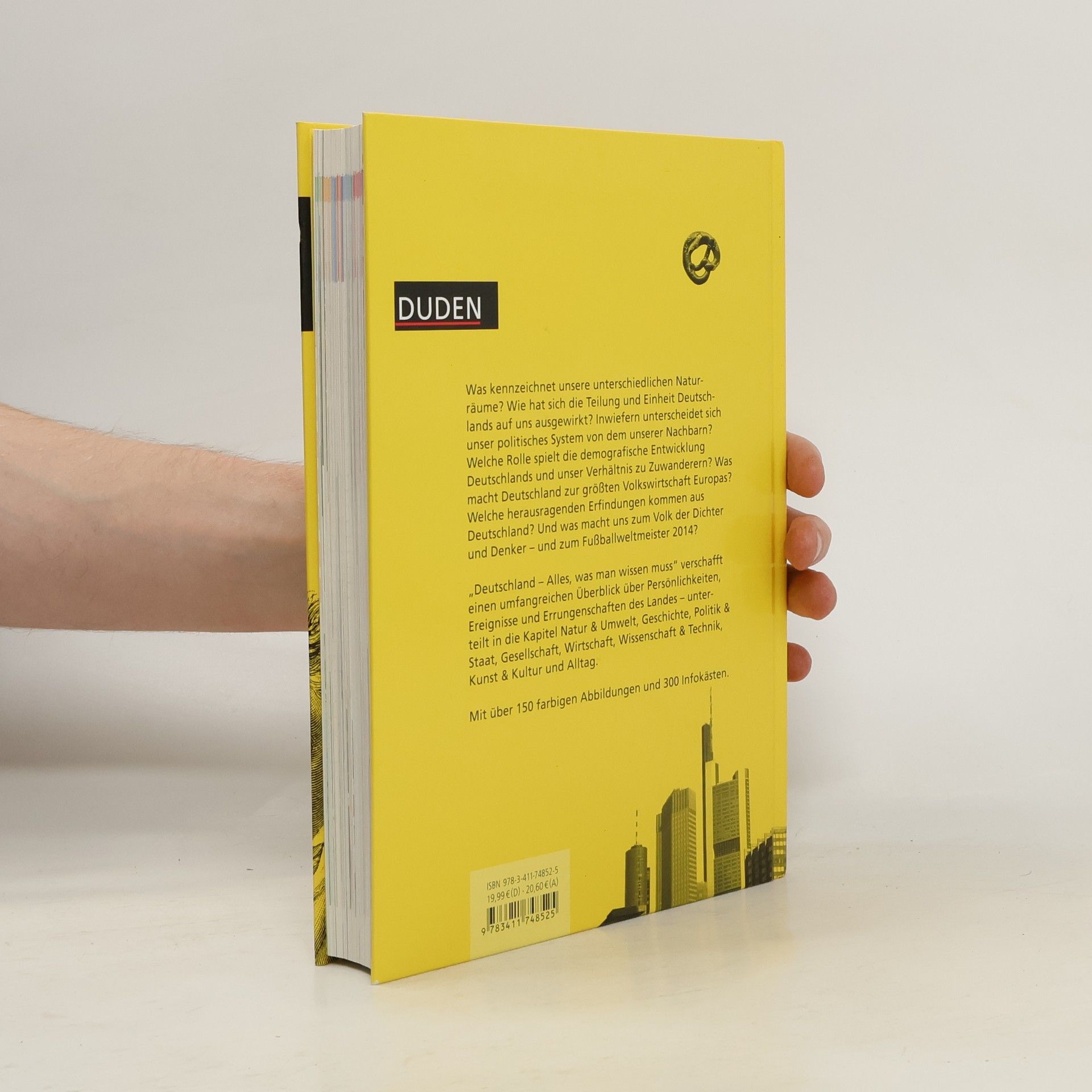 VON A BIS Z: DIE BUNTE REPUBLIK DEUTSCHLAND Deutschland zählt zu den beliebtesten Ländern weltweit. Doch trotz seiner Popularität ist vielen nicht bekannt, was unser Land eigentlich ausmacht. Wer weiß schon, in welchen Bundesländern die schönsten Barockschlösser stehen? Oder welche Nationalparks und Seen jährlich Tausende Besucher anlocken? Der neue Duden „Deutschland – Alles, was man wissen muss“ ist dafür der ideale Deutschlanderklärer. Auf fast 400 Seiten stehen die wichtigsten Fakten zu den Themen Natur und Umwelt, Geschichte, Politik und Staat, Gesellschaft, Wirtschaft, Wissenschaft und Technik, Kunst und Kultur sowie Alltag. Damit können Sie ab sofort Ihre Allgemeinbildung auffrischen. Beim nächsten Smalltalk mit Insiderwissen glänzen. Oder die Vielfalt vor der eigenen Haustür mit ganz neuen Augen entdecken. EIN MUST-HAVE FÜR JEDES BÜCHERREGAL Die geballte Ladung Deutschland-Know-how ist die aktuellste, die es derzeit in Buchform gibt. Alles andere als „trocken“ präsentiert das Kompendium spannende Persönlichkeiten, Erfindungen und Ereignisse unseres Landes – von Adorno bis Zille, vom Airbag bis zum Zeppelin, von der Agenda 2010 bis zum ZDF. Ergänzt werden die Texte von über 150 farbigen Abbildungen und 300 Infokästen. Das alles ist Deutschland, das alles sind wir – jetzt im Duden!