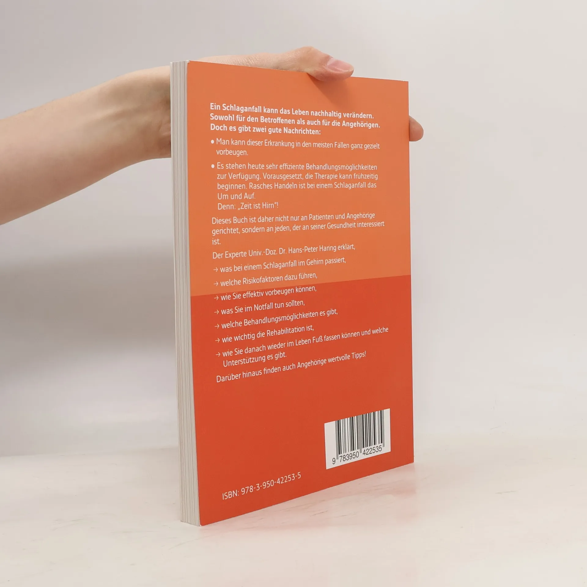 Ein Schlaganfall kann das Leben nachhaltig verändern. Sowohl für den Betroffenen als auch für die Angehörigen. Doch es gibt zwei gute Nachrichten: • Man kann dieser Erkrankung in den meisten Fällen ganz gezielt vorbeugen. • Es stehen heute sehr effiziente Behandlungsmöglichkeiten zur Verfügung. Vorausgesetzt, die Therapie kann frühzeitig beginnen. Rasches Handeln ist bei einem Schlaganfall das Um und Auf. Denn: „Zeit ist Hirn“! Dieses Buch ist daher nicht nur an Patienten und Angehörige gerichtet, sondern an jeden, der an seiner Gesundheit interessiert ist. Der Experte Univ.-Doz. Dr. Hans-Peter Haring erklärt, > was bei einem Schlaganfall im Gehirn passiert, > welche Risikofaktoren dazu führen, > wie Sie effektiv vorbeugen können, > was Sie im Notfall tun sollten, > welche Behandlungsmöglichkeiten es gibt, > wie wichtig die Rehabilitation ist, > wie Sie danach wieder im Leben Fuß fassen können und welche Unterstützung es gibt. Darüber hinaus finden auch Angehörige wertvolle Tipps!