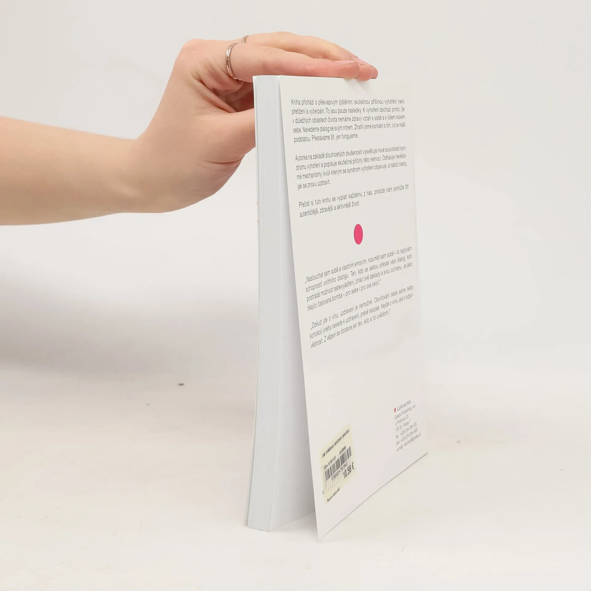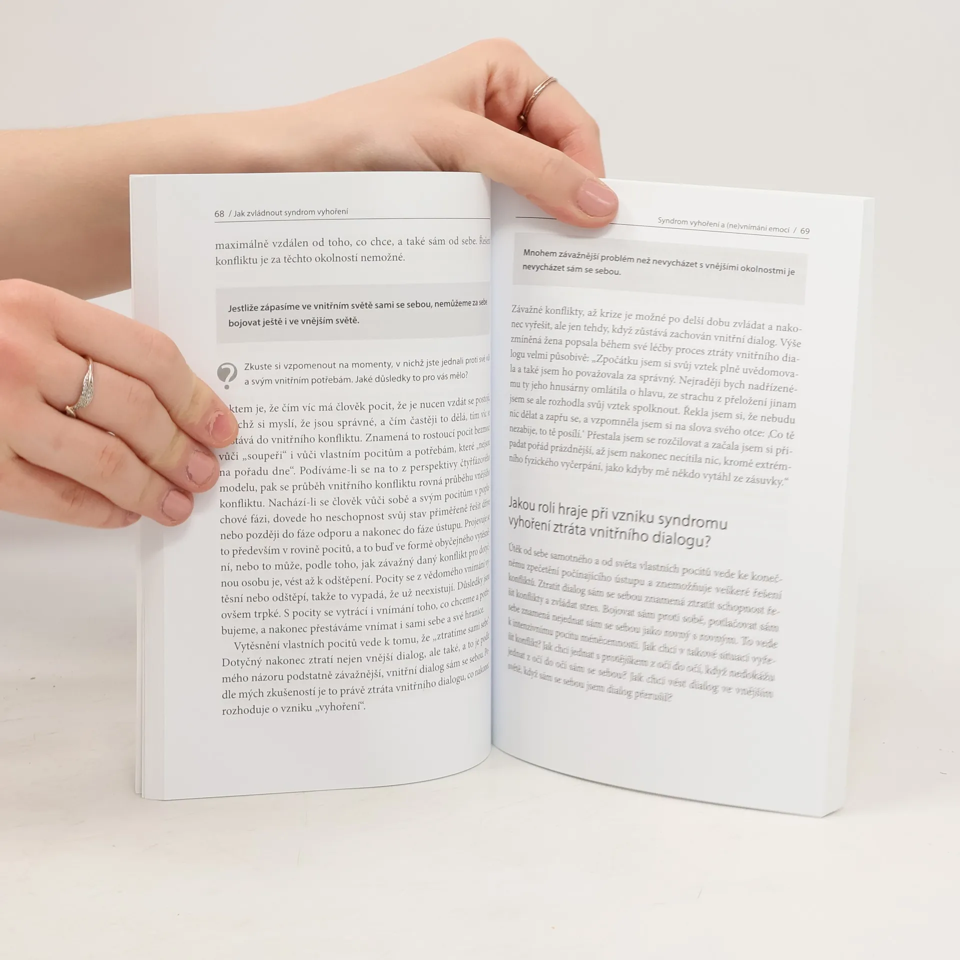 Kniha přichází s překvapivým zjištěním: skutečnou příčinou vyhoření není přetížení a vyčerpání. To jsou pouze následky. K vyhoření dochází proto, že v důležitých oblastech života nemáme zdravý vztah k sobě a k lidem kolem sebe. Nevedeme dialog se svým nitrem. Ztratili jsme kontakt s tím, co je naší podstatou. Přestáváme žít, jen fungujeme. Autorka na základě dlouholetých zkušeností vysvětluje nové souvislosti syndromu vyhoření a popisuje skutečné příčiny této nemoci. Odhaluje nevědomé mechanismy, kvůli kterým se syndrom vyhoření objevuje, a nabízí cesty, jak se znovu uzdravit. Přečíst si tuto knihu se vyplatí každému z nás, protože nám pomůže žít autentičtější, zdravější a aktivnější život.