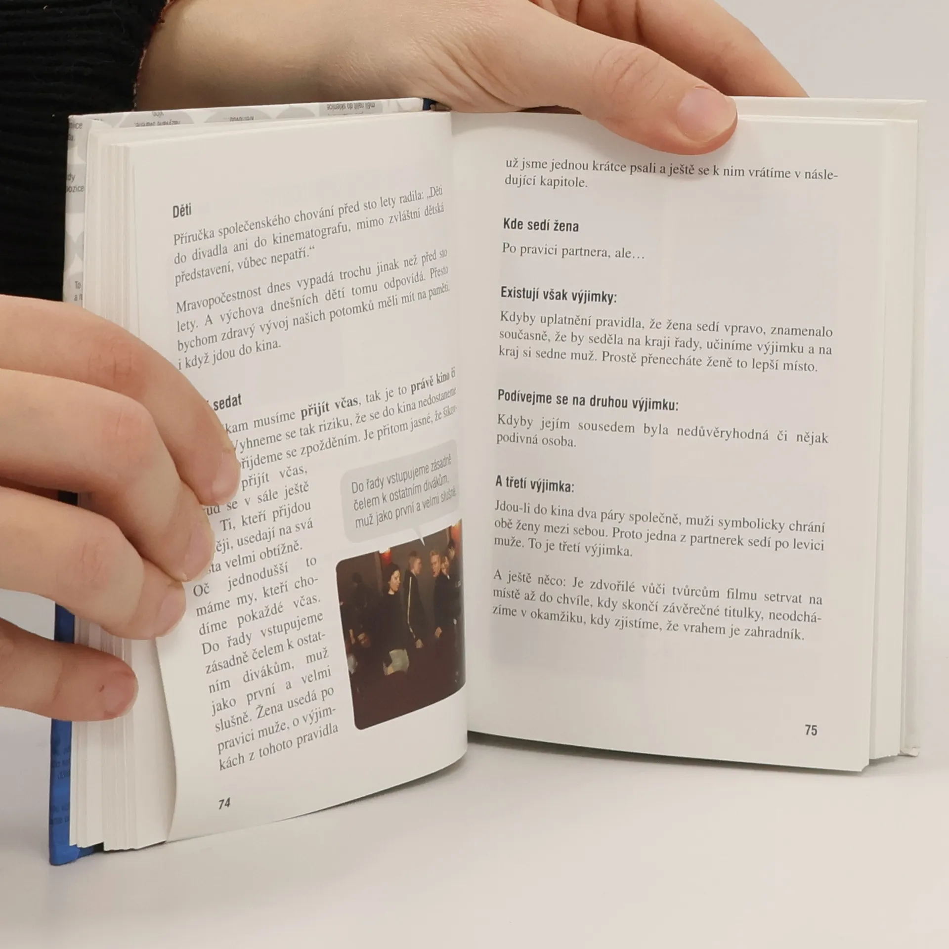 Nabízí základní pravidla vhodného chování při nejrůznějších společenských událostech - od každodenních běžných aktivit po mimořádné příležitosti. Uvádí zásady vhodného oblékání, stolování, konverzace. Seznamuje s pravidly při podání ruky, oslovování, představování. Radí, jak se chovat při návštěvách přátel, při pracovních pohovorech, v dopravních prostředcích, a na různých společenských akcích jako jsou různé party, recepce, firemní prezentace, vernisáže, bály. Věnuje se také svatbě. Text doplňují fotografie ze stejnojmenného úspěšného televizního cyklu.