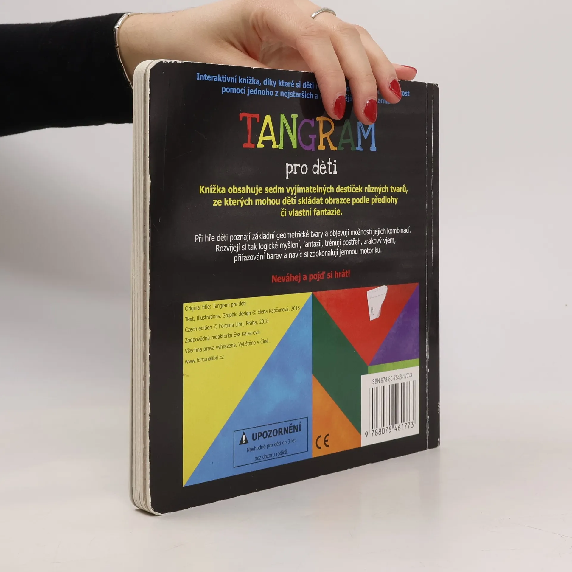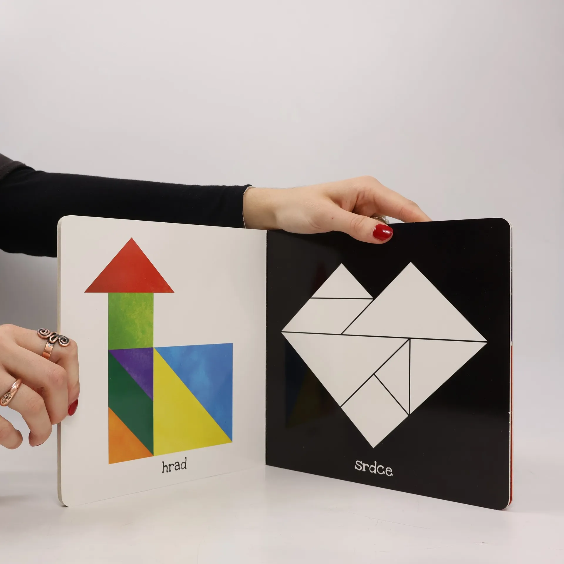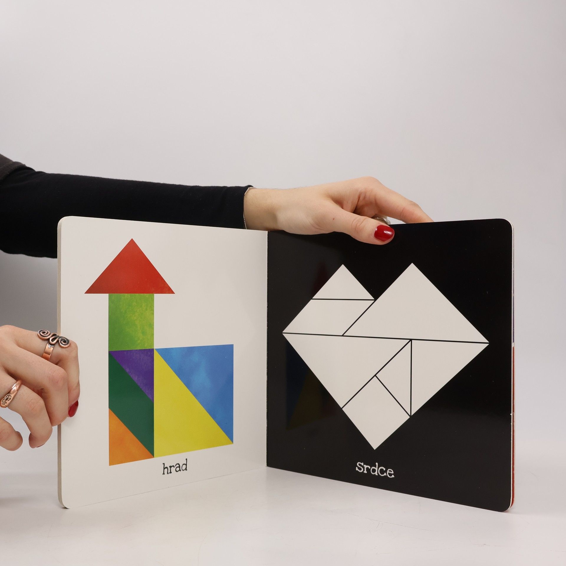 Interaktivní knížka, díky které si děti rozvíjí prostorovou představivost pomocí jednoho z nejstarších a nejznámějších hlavolamů. Knížka obsahuje sedm vyjímatelných destiček různých tvarů, ze kterých mohou děti skládat obrazce podle předlohy či vlastní fantazie. Při hře děti poznají základní geometrické tvary a objevují možnosti jejich kombinací. Rozvíjí si tak logické myšlení, fantazii, trénují postřeh, zrakový vjem, přiřazování barev a navíc si zdokonalují jemnou motoriku.