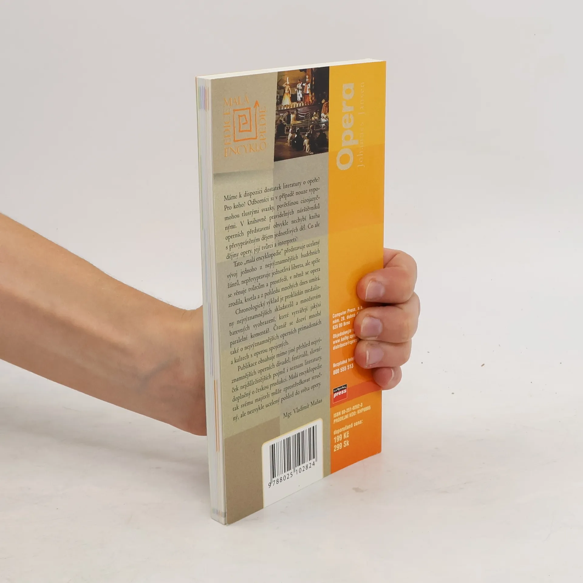 Máme k dispozici dostatek literatury o opeře? Pro koho? Odborníci si v případě nouze vypomohou tlustými svazky, povětšinou cizojazyčných. V knihovně pravidelných návštěvníků operních představení obvykle nechybí kniha s převyprávěným dějem jednotlivých děl. Co ale dějiny opery, její tvůrci a interpreti? Tato "malá encyklopedie" představuje ucelený vývoj jednoho z nejvýznamnějších hudebních žánrů, nepřevypravuje jednotlivá libreta, ale spíše se věnuje tvůrcům a prostředí, v němž se opera zrodila, kvetla a z pohledu mnohých dnes umírá. Chronologický výklad je pokládán medailony nejvýznamnějších skladatelů a množstvím barevných vyobrazení, které vytvářejí jakýsi paralelní komentář. Čtenář se dozví mnohé také o nejvýznamnějších operních primadonách a kultech s operou spojených. Publikace obsahuje mimo jiné přehled nevýznamnějších operních divadel, festivalů, slovníček nejdůležitějších pojmů i seznam literatury, doplněných o českou produkci. Malá encyklopedie tak svému majiteli může zprostředkovat stručný, ale nezvykle ucelený pohled do světa opery. Mgr. Vladimír Maňas
