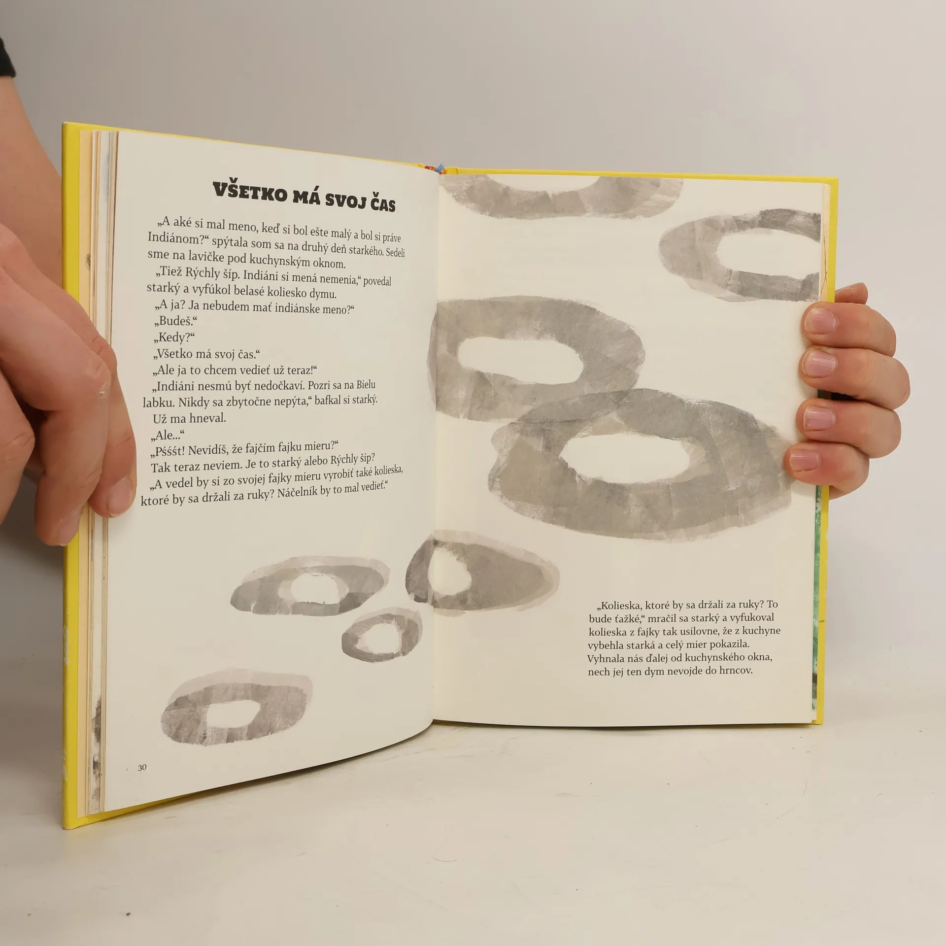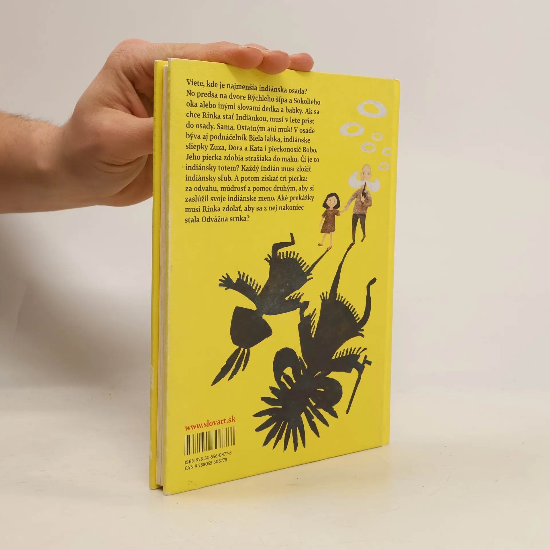 Rinka trávi prázdniny so starými rodičmi na dedine. Nie sú to len také obyčajné prázdniny, ale pravé indiánske. A ani starí rodičia nie sú len tak hocikto, Sokolie oko a Rýchly šíp totiž bývajú v indiánskej osade, namiesto strašiaka do maku majú totem, s kamarátom Bosou nohou fajčia fajku mieru a z Rinky sa stane Odvážna srnka. Rýchly šíp má pre svoju Odvážnu srnku pripravené množstvo dobrodružstiev. A tak Rinka zistí, čo to znamená zakopať vojnovú sekeru, prečo je dôležité nevyzradiť indiánske tajomstvo, a aj to, ako sa z Kačacieho rybníka môže stať more. Knihu ilustrovala Eva Švrčková.