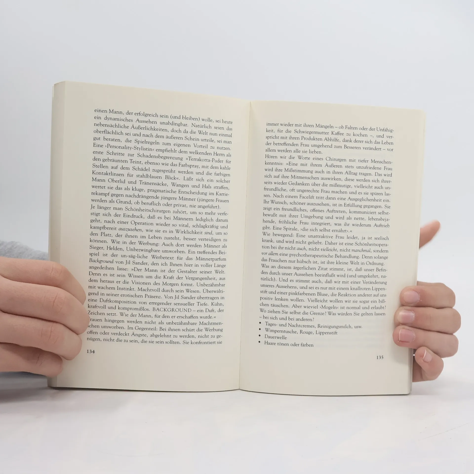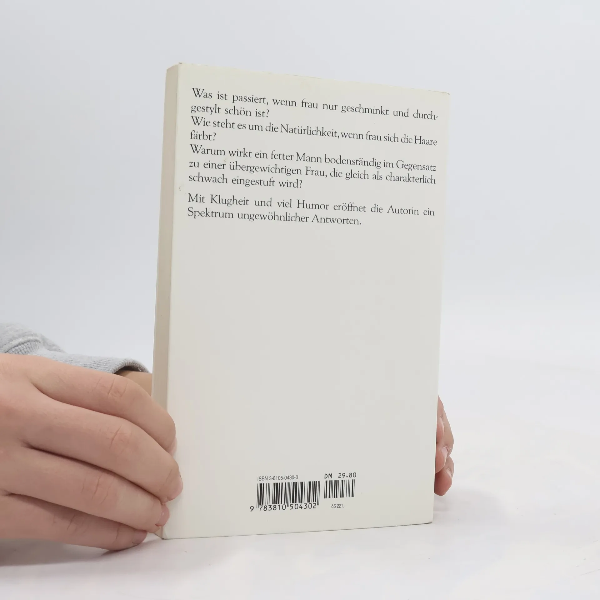 Was ist passiert, wenn frau nur geschminkt und durchgestylt schön ist?Wie steht es um Natürlichkeit, wenn frau sich die Haare färbt?Warum wirkt ein fetter Mann bodenständig im Gegensatz zu einer übergewichtien Frau, die gleich als charakterlich schwach eingestuft wird?Mit Klugheit und viel Humor eröffnet die Autorin ein Spektrum ungewöhnlicher Antworten.