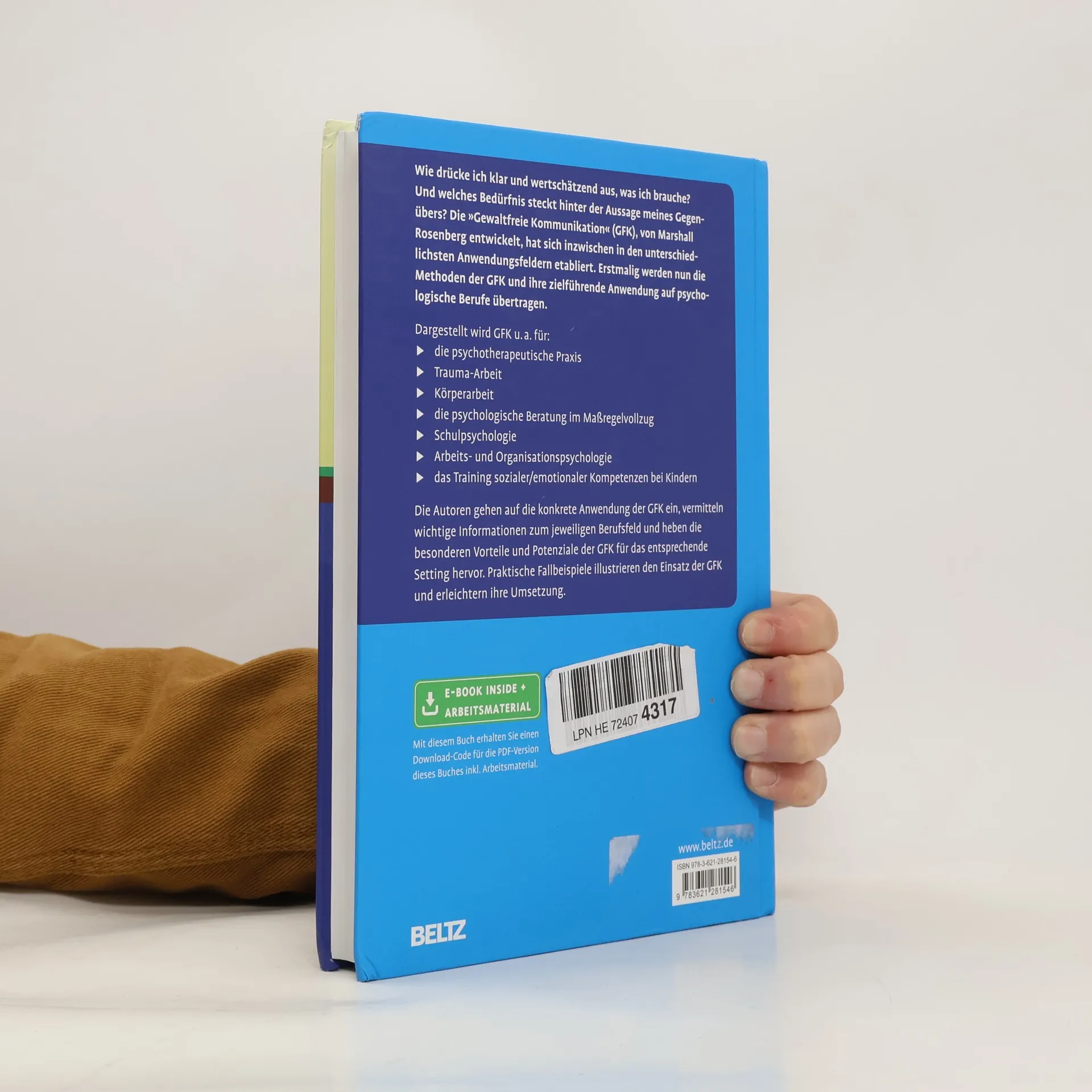 Die »Gewaltfreie Kommunikation« (GFK) ist ein Kommunikationskonzept, das von Marshall Rosenberg entwickelt wurde und inzwischen in unterschiedlichen Bereichen eingesetzt wird. Im Mittelpunkt steht die Entwicklung einer wertschätzenden Beziehung zum Gegenüber, die mehr Kooperation ermöglicht. Geiger und Baumgartner übertragen nun erstmalig die Methoden der GFK und ihre zielführende Anwendung auf die Psychologie und Psychotherapie. Die Autoren vermitteln nützliche Informationen zum jeweiligen Berufsfeld, gehen auf die konkrete Anwendung der GFK in diesem Bereich ein und heben besondere Vorteile und Potenziale der GFK für das entsprechende Setting hervor. Praktische Fallbeispiele veranschaulichen außerdem die Durchführung. Mit E-Book inside und Arbeitsmaterial Aus dem Inhalt Grundlagen der Gewaltfreien Kommunikation (GFK) • GFK in der psychotherapeutischen Praxis • GFK in der Traumaarbeit • GFK in der Körperarbeit • GFK in der psychologischen Beratung im Maßregelvollzug • Transformation schmerzhafter Erfahrungen • GFK in der Schulpsychologie • GFK in der Arbeits- und Organisationspsychologie • GFK im Training sozialer/emotionaler Kompetenzen bei Kindern