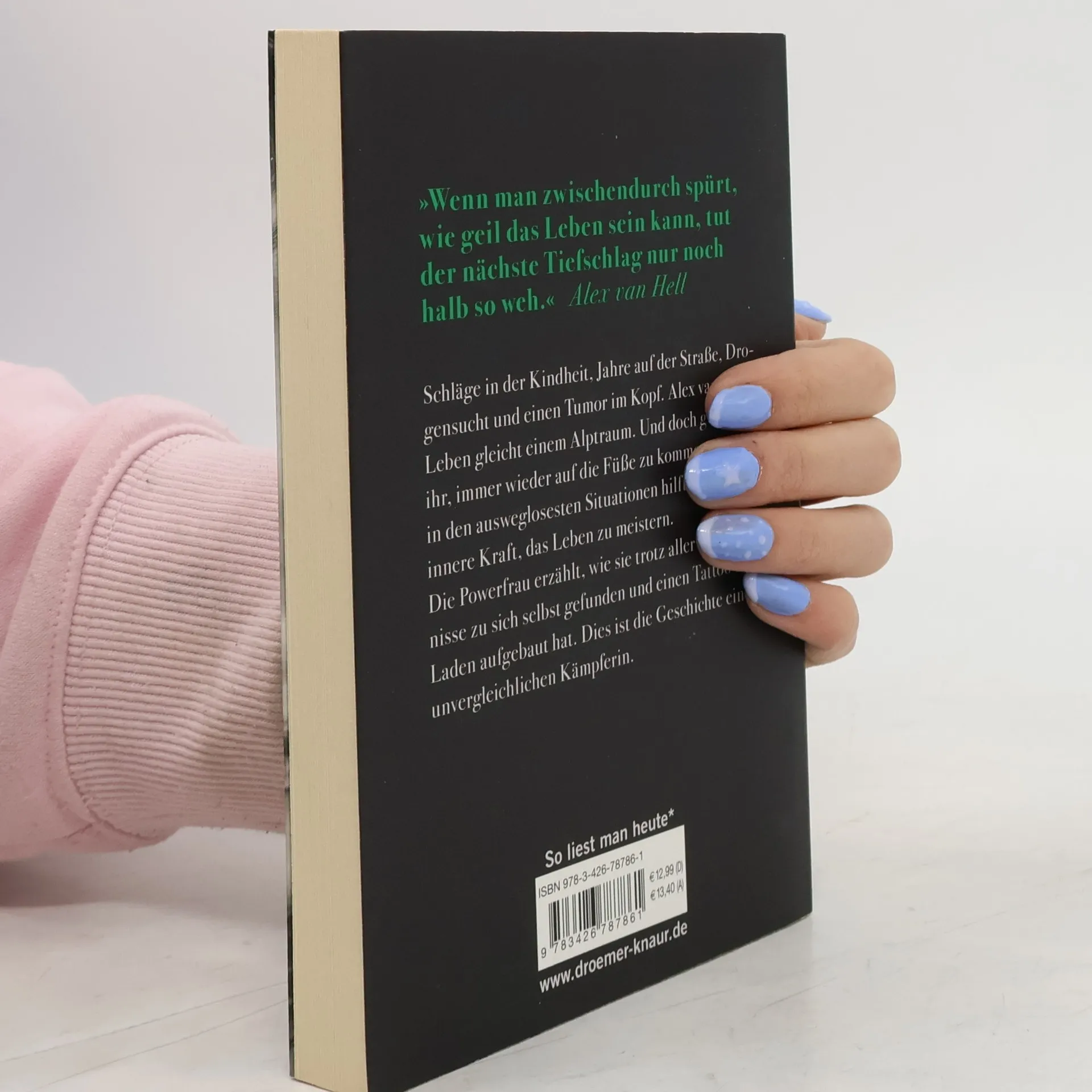 Alex hat so viel mitgemacht, das reicht für zwölf Leben: Ihr leiblicher Vater ist Alkoholiker, vor dem die Familie flieht, die Mutter holt einen Lebensgefährten ins Haus, der Alex und ihre Schwester immer wieder verprügelt; als Teenager schließlich stürzt Alex total ab. Sie gerät in einen Strudel aus Drogen und Gewalt und wird mit 16 Jahren obdachlos. Mit zwanzig fängt sie mit dem Gogo-Tanz an und sichert sich damit ihre Existenz, führt endlich ein Leben, das sie lieben kann. Sie versöhnt sich sogar mit ihrer Mutter, als diese an Brustkrebs erkrankt. Doch wenig später der Rückschlag: Ein Tumor breitet sich in Alex van Hells Kopf aus, erst nach einem epileptischen Anfall nehmen sich die Ärzte ihrer an. Das Kavernom kann entfernt werden, die Epilepsie, die es ausgelöst hat, wird bleiben. Und trotz allem schafft es Alex, sich ein weiteres Mal aufzurappeln. Heute, fünf Jahre später, hat sie ein eigenes Tattoo-Studio, ist ein begehrtes Tattoo-Model, Barkeeperin und Geschäftsführerin eines Fetisch-Clubs. Dieses Buch ist die Geschichte einer unvergleichlichen Kämpferin.
