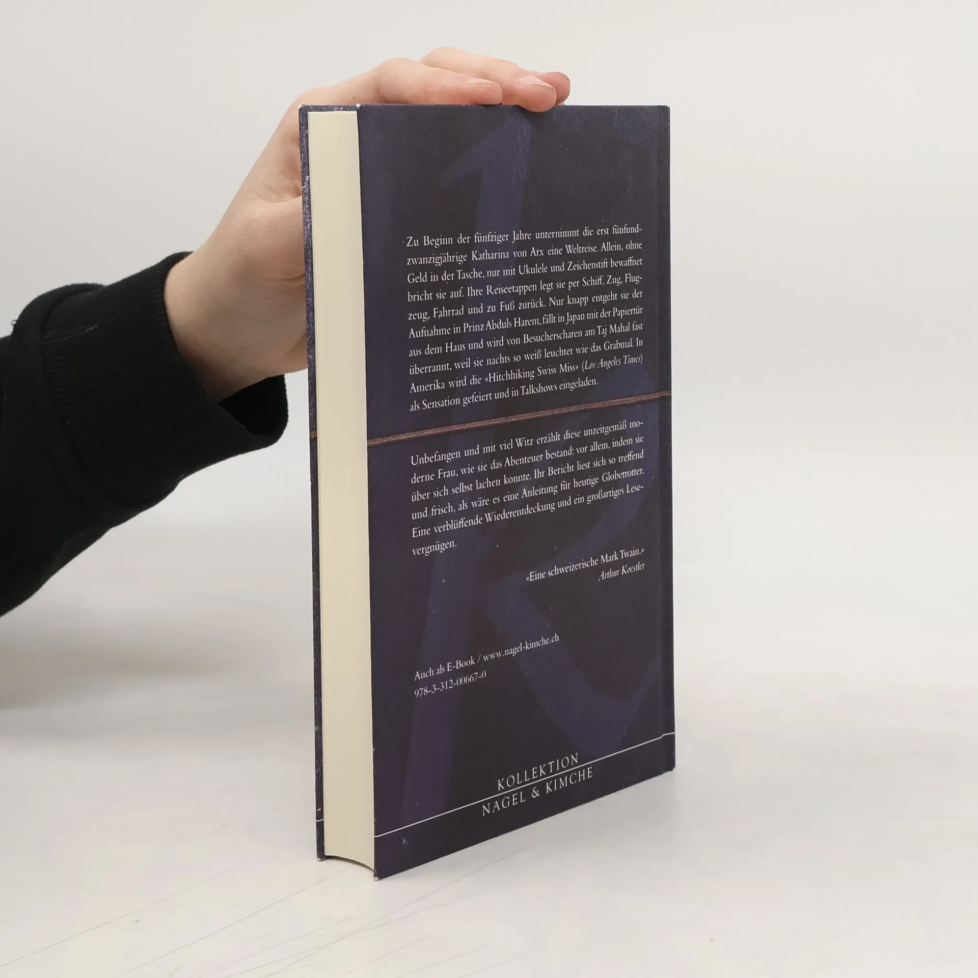 Eine verblüffende Wiederentdeckung: Zu Beginn der 50er Jahre unternahm eine junge Frau eine Weltreise, allein und ohne Geld in der Tasche. Von Wien aus schafft sie es über Indien, Burma und Japan bis in die USA. Unterwegs entgeht sie nur knapp der Aufnahme in Prinz Abduls Harem, fällt in Japan mit der Papiertür aus dem Haus und wird von Besucherscharen am Taj Mahal überrannt, weil sie nachts noch weißer leuchtet als das Grabmal. Im Amerika der Nachkriegszeit wird ihr Mut als Sensation gefeiert. Katharina von Arx' Bericht liest sich so modern und frisch, als wäre es eine Anleitung für heutige Globetrotter – und er zeigt, wie sie das Abenteuer bestand: vor allem, indem sie über sich selbst lachen konnte.