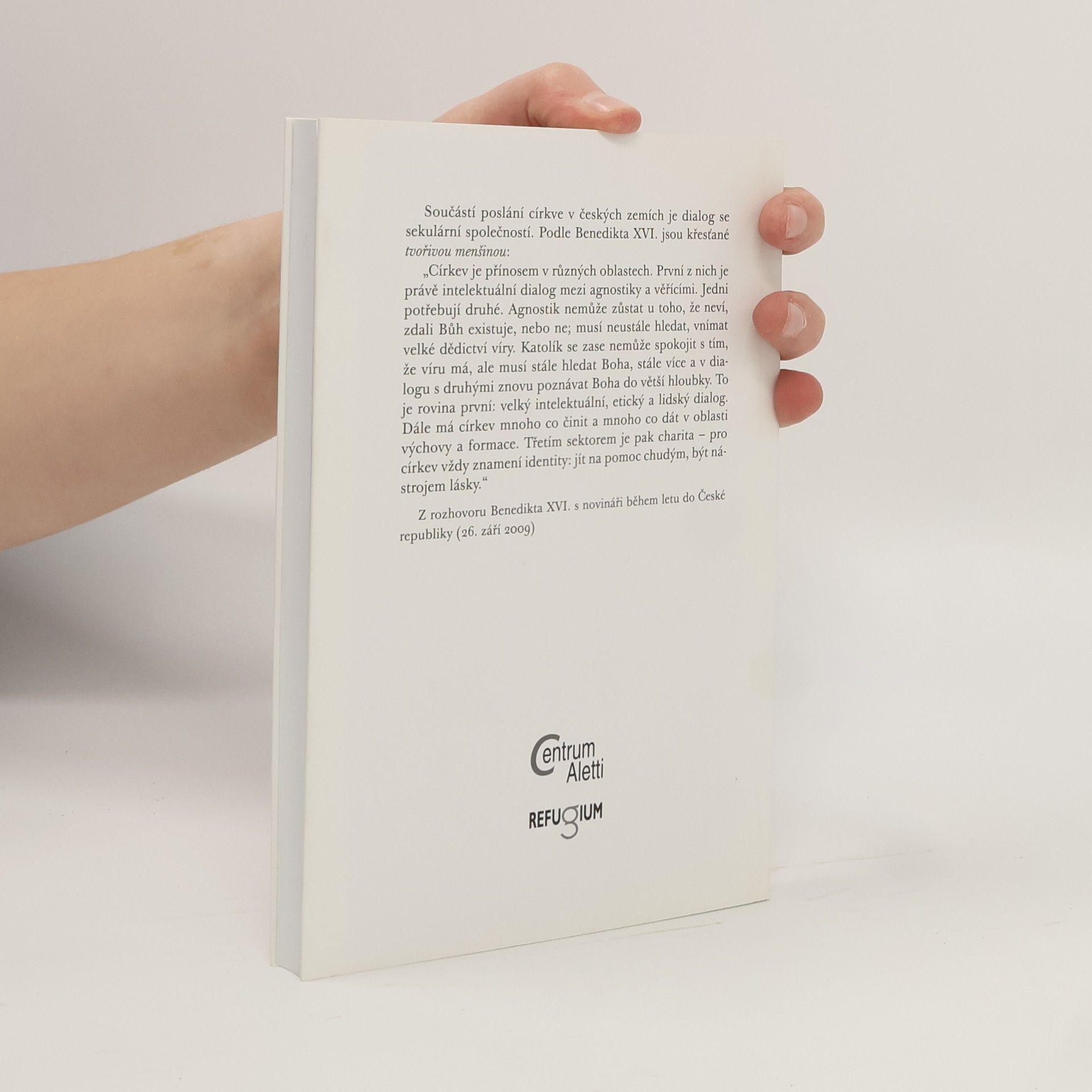 κήρυγμα /μαρτυρία – λειτουργία – διακονία. Součástí poslání církve v českých zemích je dialog se sekulární společností. Podle Benedikta XVI. jsou křesťané tvořivou menšinou: "Církev je přínosem v různých oblastech. První z nich je právě intelektuální dialog mezi agnostiky a věřícími. Jedni potřebují druhé. Agnostik nemůže zůstat u toho, že neví, zdali Bůh existuje, nebo ne; musí neustále hledat, vnímat velké dědictví víry. Katolík se zase nemůže spokojit s tím, že víru má, ale musí stále hledat Boha, stále více a v dialogu s druhými znovu poznávat Boha do větší hloubky. To je rovina první: velký intelektuální, etický a lidský dialog. Dále má církev mnoho co činit a mnoho co dát v oblasti výchovy a formace. Třetím sektorem je pak charita – pro církev vždy znamení identity: jít na pomoc chudým, být nástrojem lásky." Z rozhovoru Benedikta XVI. s novináři během letu do České republiky (26. září 2009)
