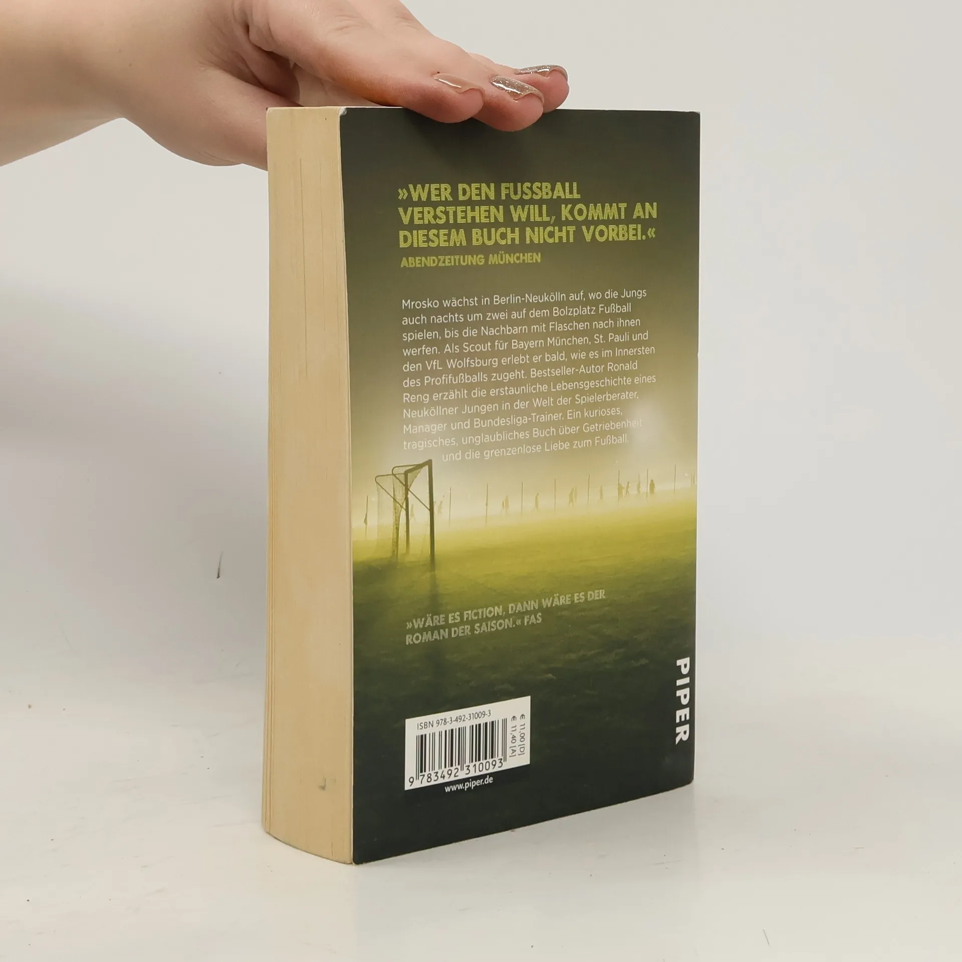 Lars Mrosko wächst in Berlin-Neukölln auf, wo die Jungs auch nachts um zwei auf dem Bolzplatz Fußball spielen, bis die Nachbarn mit Flaschen nach ihnen werfen. Als Scout für Bayern München, St. Pauli und den VfL Wolfsburg erlebt er bald, wie es im Innersten des Profifußballs zugeht. Auf der Jagd nach den besten Spielern durchkämmt er Trainingsplätze in ganz Europa. – Bestsellerautor Ronald Reng erzählt die erstaunliche Lebensgeschichte eines Neuköllner Jungen in der Welt der Spielerberater, Manager und Bundesliga-Trainer. Ein kurioses, tragisches, unglaubliches Buch über Getriebenheit und die grenzenlose Liebe zum Fußball.