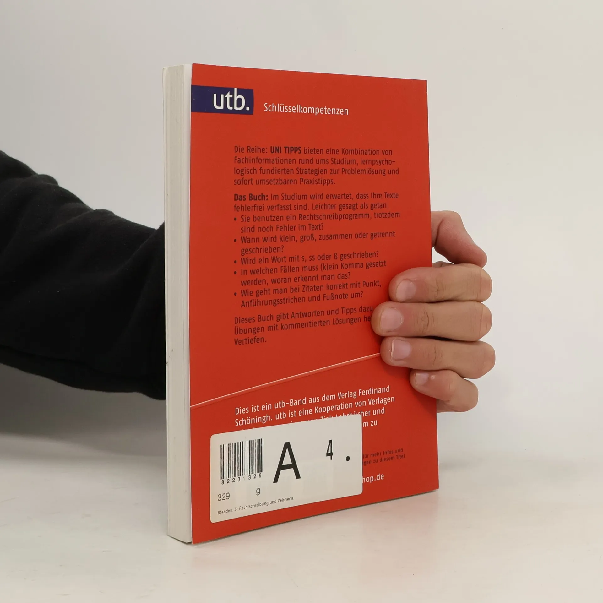 Schreibt man „kurz schließen“ oder „kurzschließen“? Funktioniert Kommasetzung nach Gefühl? Und hat, wer richtig schreibt, recht oder Recht? Steffi Staaden erklärt Studierenden systematisch Grundlagen und Zweifelsfälle der deutschen Rechtschreibung und Zeichensetzung. Viele Übungen mit kommentierten Lösungen helfen, die Regeln zu verinnerlichen. So gibt es in der nächsten Klausur oder Hausarbeit keine Unsicherheiten mehr. Die Reihe UNI TIPPS bieten eine Kombination von Fachinformationen rund ums Studium, lernpsychologisch fundierten Strategien zur Problemlösung und sofort umsetzbaren Praxistipps.