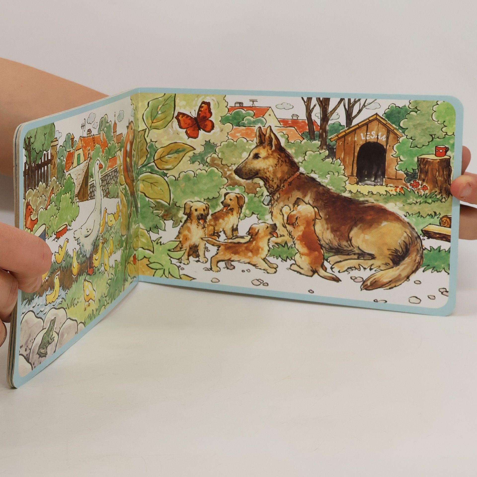 Obrazové leporelo bez textu o domácích zvířatech.
