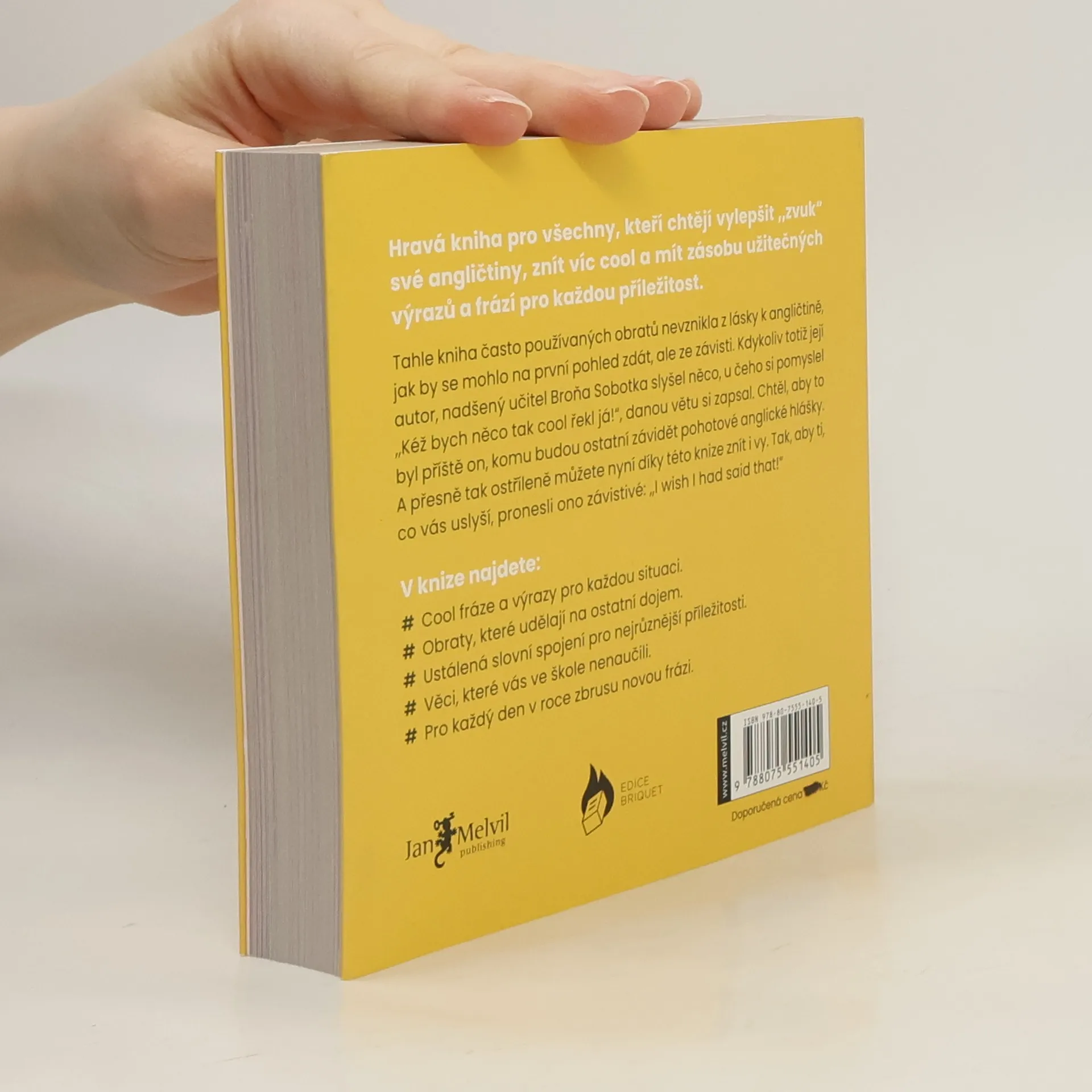 I wish I had said that! — Kéž bych to byl řekl! … takhle znělo jediné kritérium pro výběr 365 cool anglických frází a výrazů, které v této knize najdete. Broňa, nadšený učitel angličtiny z Brna, autor titulu Zamilujte se do angličtiny, přidává do svého knižního portfolia neodolatelný doplněk pro každého uživatele tohoto jazyka. Téměř rok vybíral se svým kamarádem, studujícím toho času v USA, často užívané fráze, idiomy či ustálená rčení, jejichž význam byste s pouhou znalostí jednotlivých slovíček nerozklíčovali. Výsledkem je jedna cool fráze pro každý den v roce, takže až za 365 dní pohlédnete na svůj pokrok, tak budete i díky připojené online cvičebnici v užívání i porozumění angličtiny o 365 frází protřelejší. Knihou vás doprovodí zábavné grafické zpracování Martiny Lagové, postavička malého Broni a ukázkové užití dané fráze.