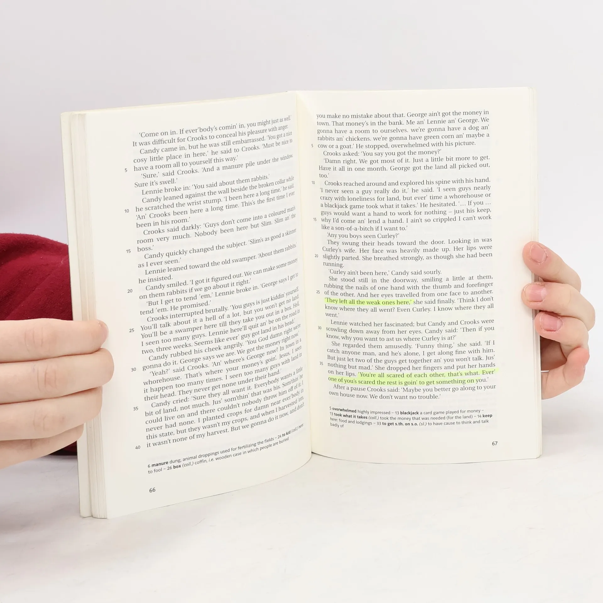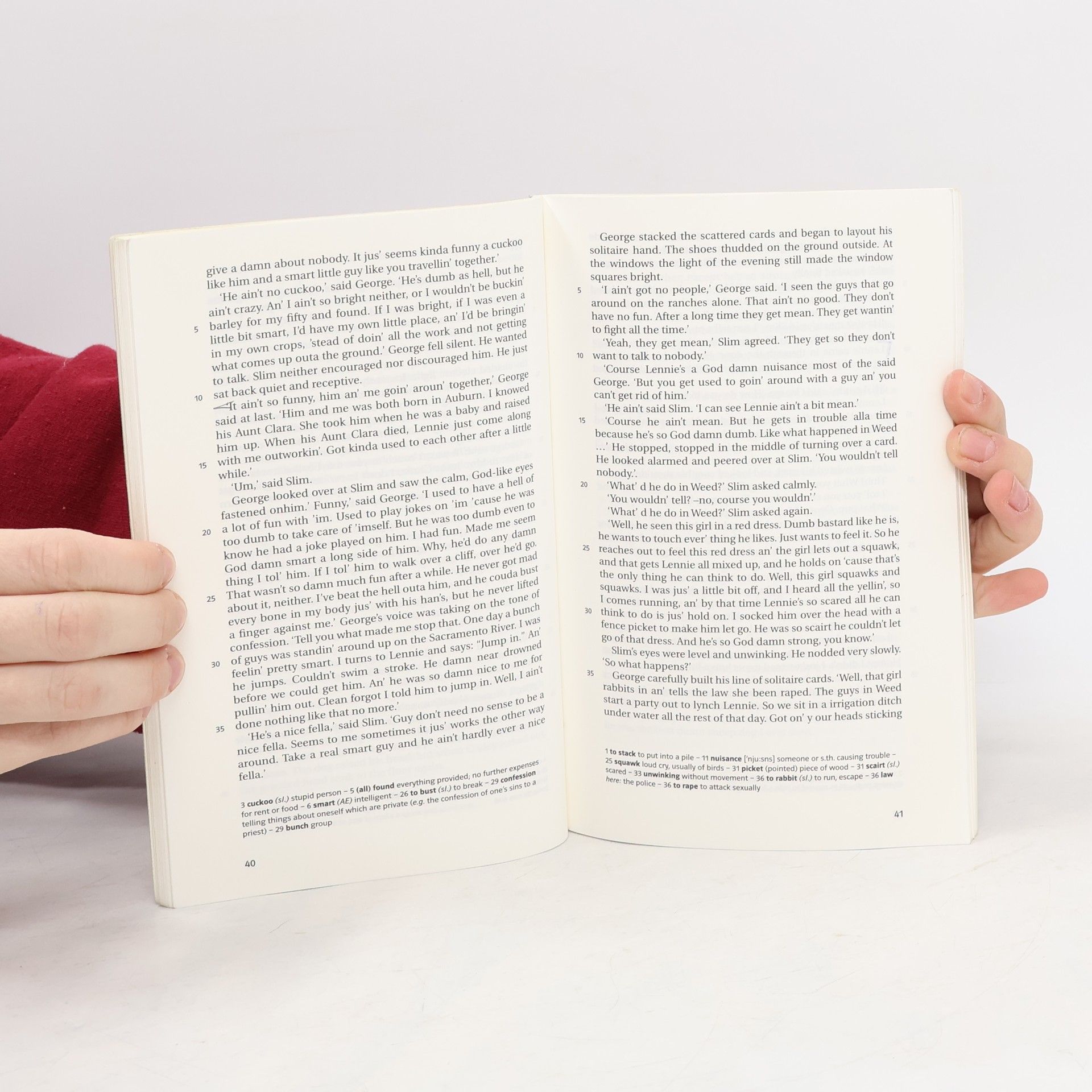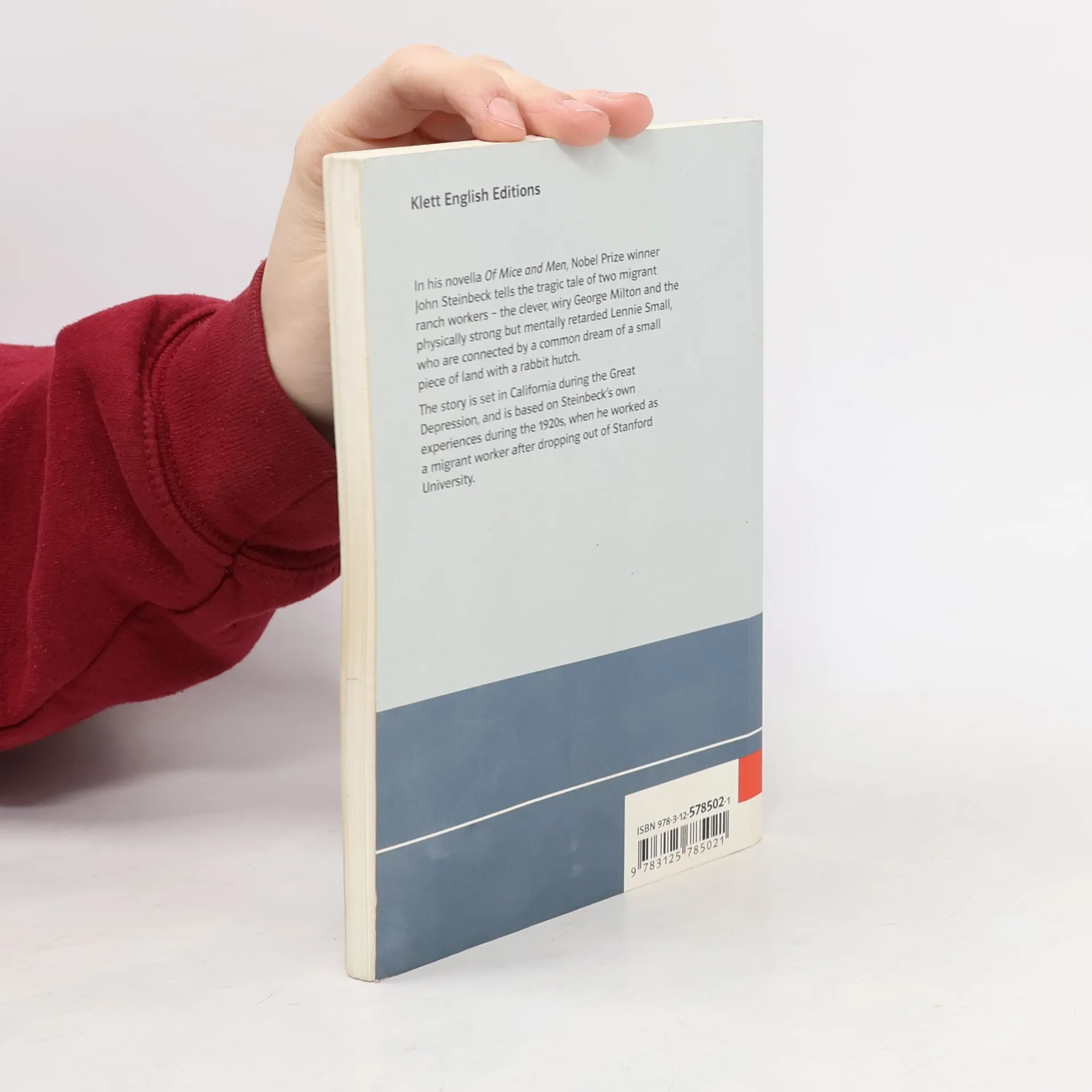 John Steinbeck tells the tragic tale of two migrant ranch workers - the clever, wiry George Milton and the physically strong but mentally retarded Lennie Small, who are connected by a common dream of a small piece of land with a rabbit hutch. (Buchdeckel verso).