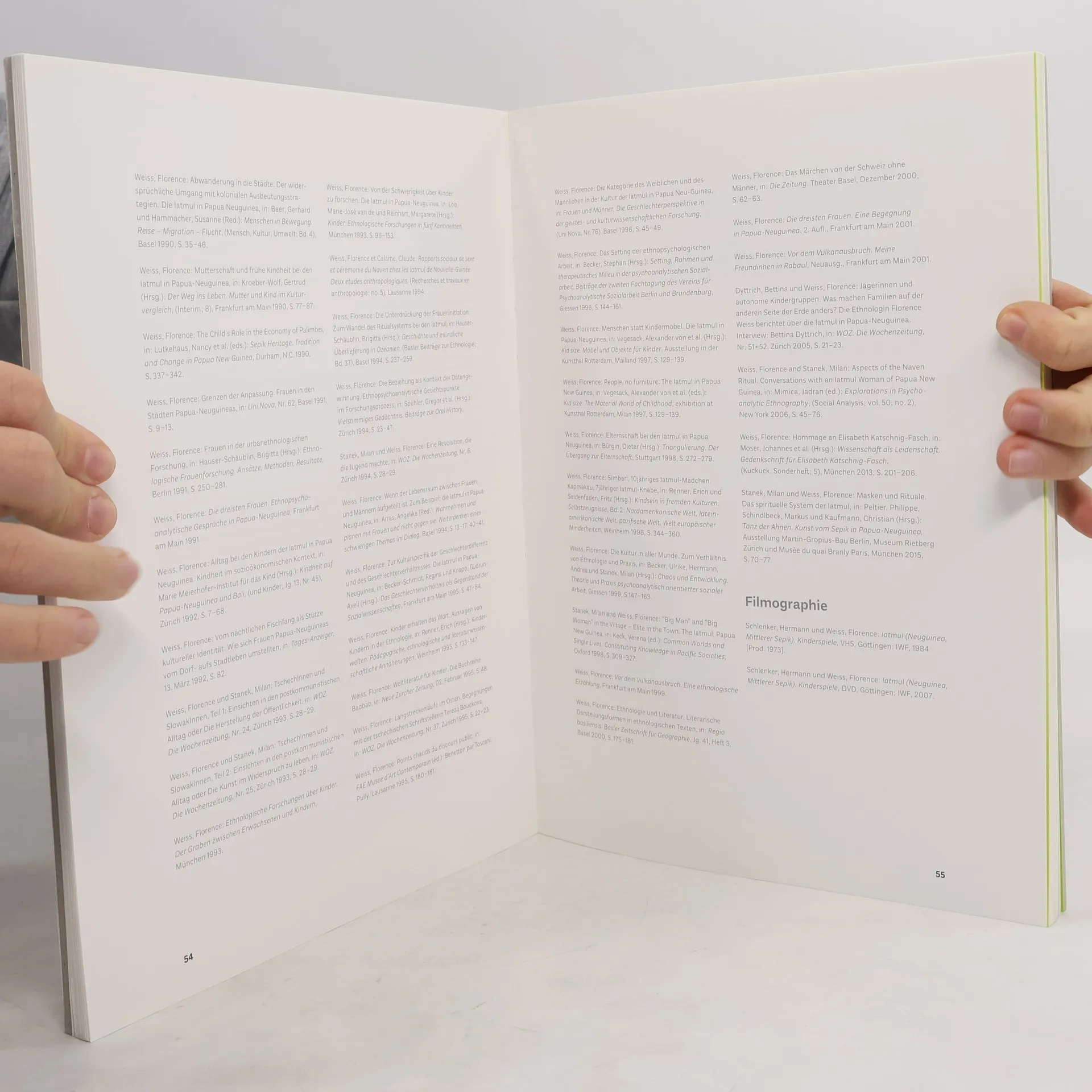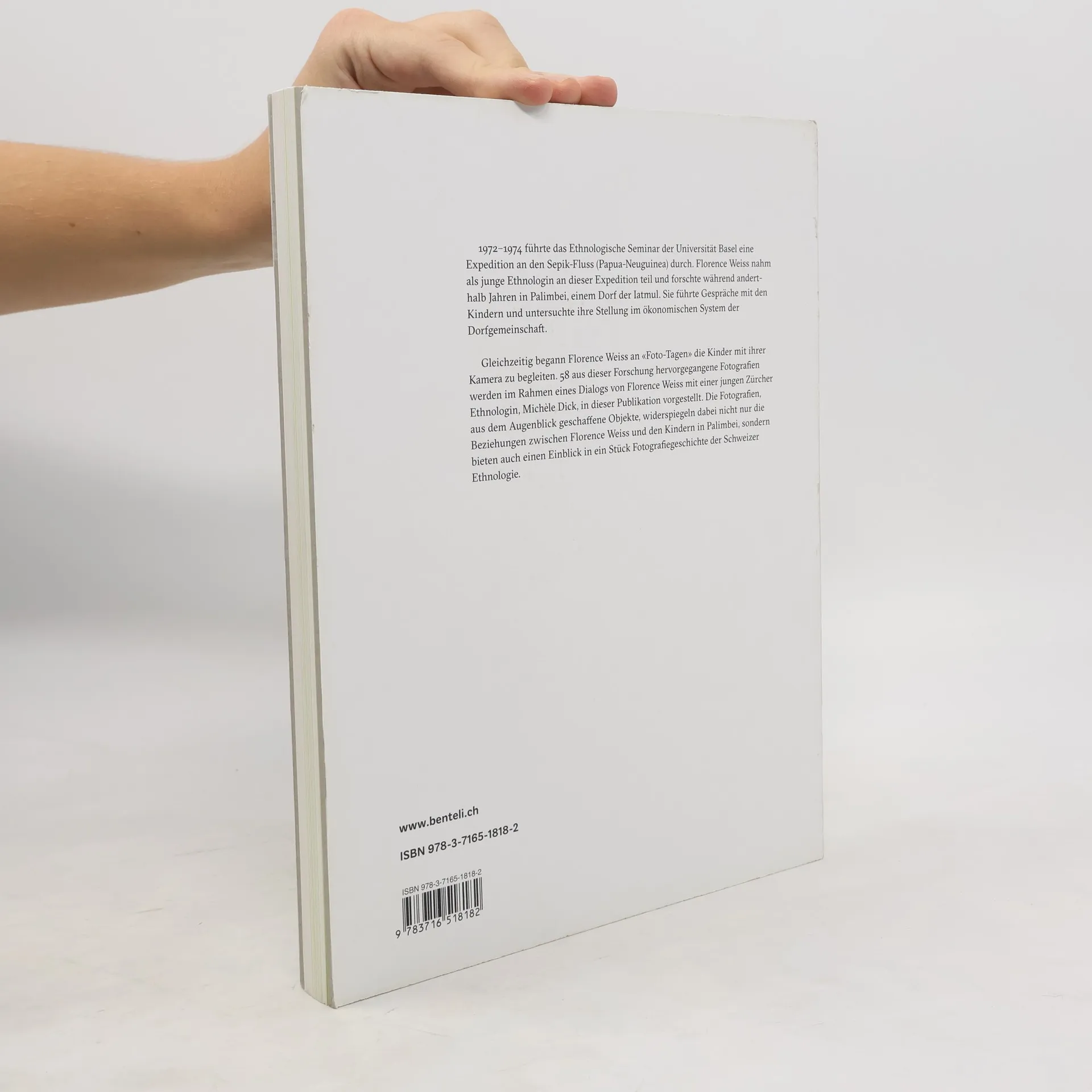 1972–1974 führte das Ethnologische Seminar der Universität Basel eine Expedition am mittleren Sepik in Papua-Neuguinea durch. Florence Weiss nahm als junge Ethnologin an dieser Expedition teil und forschte anderthalb Jahre in Palimbei, einem kleinen Dorf der Iatmul. Ihr Untersuchungsschwerpunkt war die Stellung der Kinder im sozio-ökonomischen System der Dorfgemeinschaft. Gleichzeitig begann sie an „Foto-Tagen“ die Kinder mit ihrer Kamera zu begleiten. Rund 60 aus dieser Forschung hervorgegangene Fotografien werden im Rahmen eines Dialogs von Florence Weiss mit der jungen Zürcher Ethnologin Michèle Dick in dieser Publikation vorgestellt. Die Fotografien, als aus dem Augenblick geschaffene Objekte, spiegeln dabei nicht nur die Beziehung zwischen Florence Weiss und den Kindern in Palimbei wider sondern bieten auch einen Einblick in ein Stück ethnologischer Fotografiegeschichte.