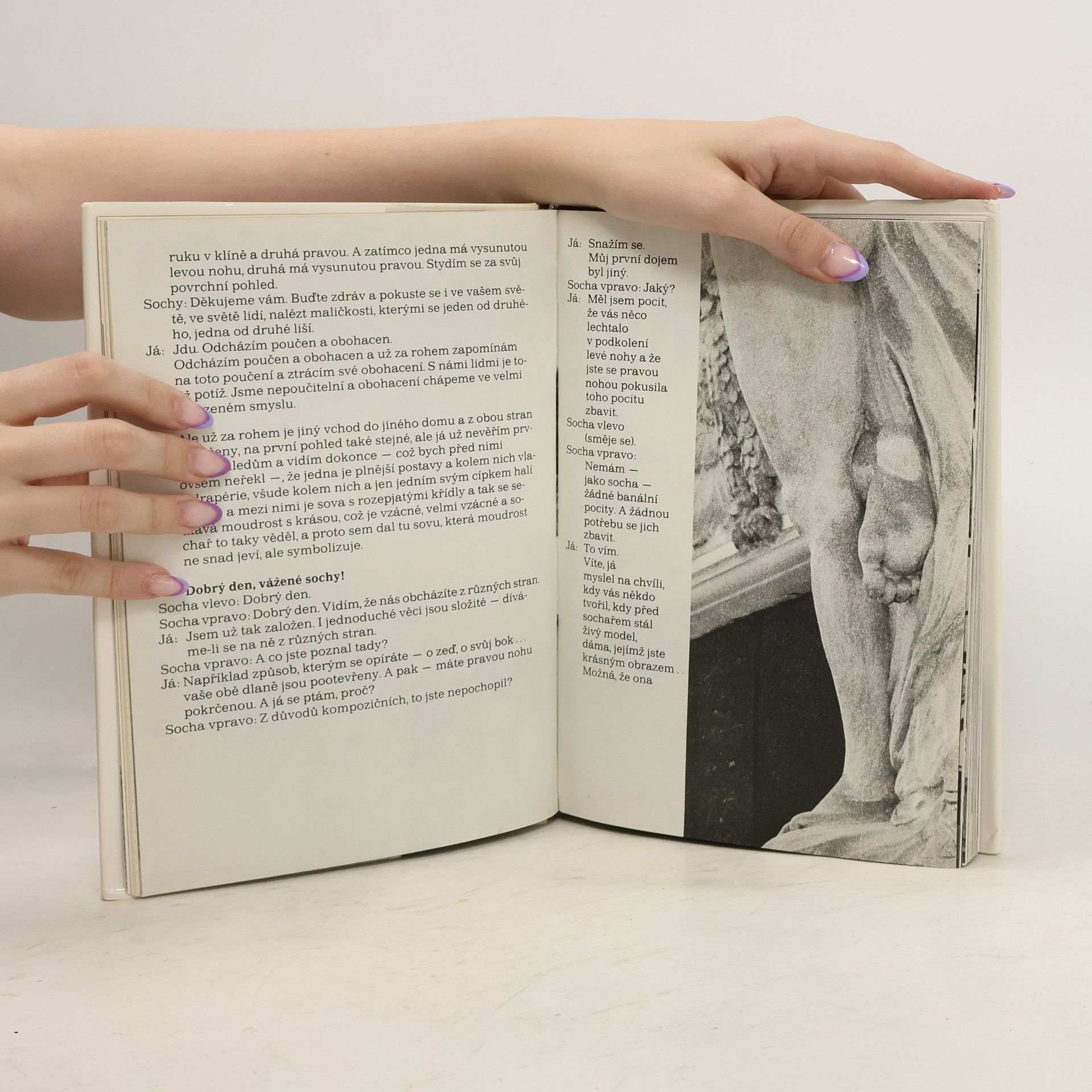 Rozhovory Miroslava Horníčka se sochami, doplněno mnoho autorových fotografií soch a skulptur.