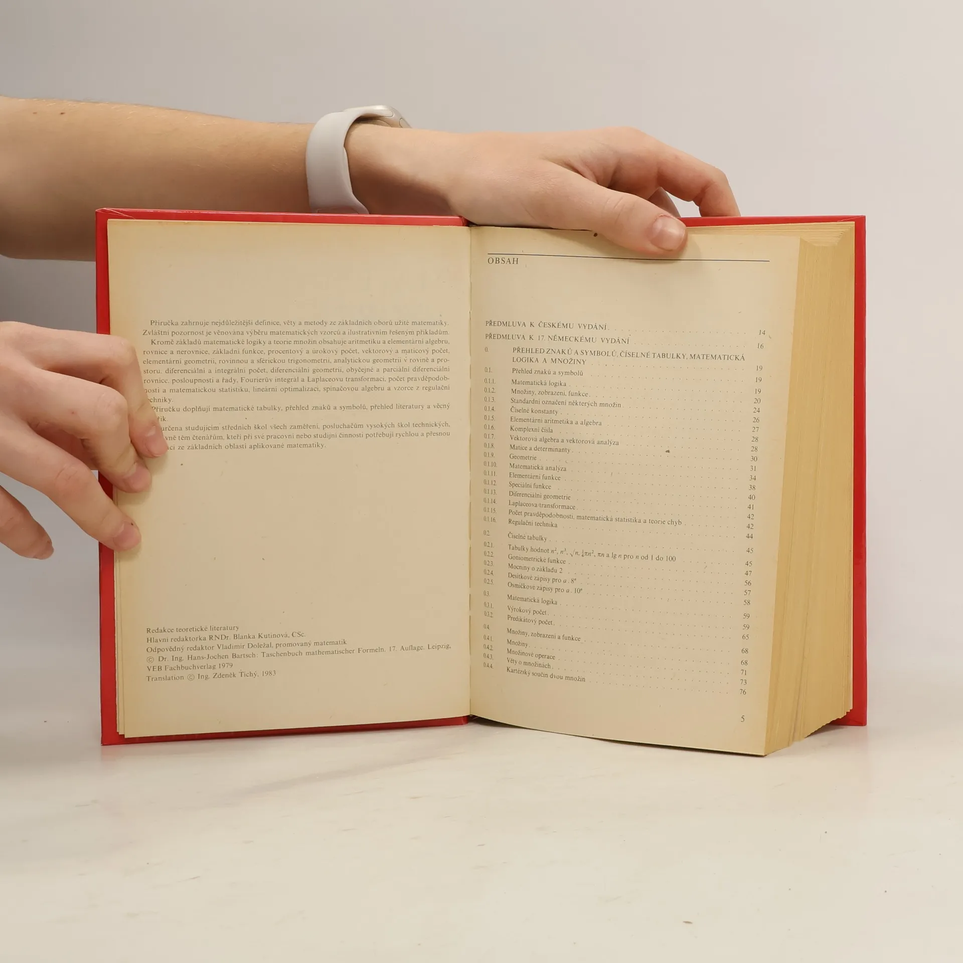 Publikace zahrnuje nejdůležitější definice, věty a metody ze základních oborů užité matematiky. Zvláštní pozornost je věnována výběru matematických vzorců a ilustrativním řešeným příkladům. Kromě základů matematické logiky a teorie množin obsahuje aritmetiku a elementární algebru, rovnice a nerovnice, základní funkce, procentový a úrokový počet, vektorový a maticový počet, elementární geometrii, rovinnou a sférickou trigonometrii, analytickou geometrii v rovině a prostoru, diferenciální a integrální počet, diferenciální geometrii, obyčejné a parciální diferenciální rovnice, posloupnosti a řady, Fourierův integrál a Laplaceovu transformaci, počet pravděpodobnosti a matematickou statistiku, lineární optimalizaci, spínačovou algebru a vzorce z regulační techniky. Knihu doplňují matematické tabulky, přehled znaků a symbolů, přehled literatury a věcný rejstřík. Je určena studujícím středních škol všech zaměření, posluchačům vysokých škol technických, ale hlavně těm čtenářům, kteří při své pracovní nebo studijní činnosti potřebují rychlou a přesnou informaci ze základní oblasti aplikované matematiky.