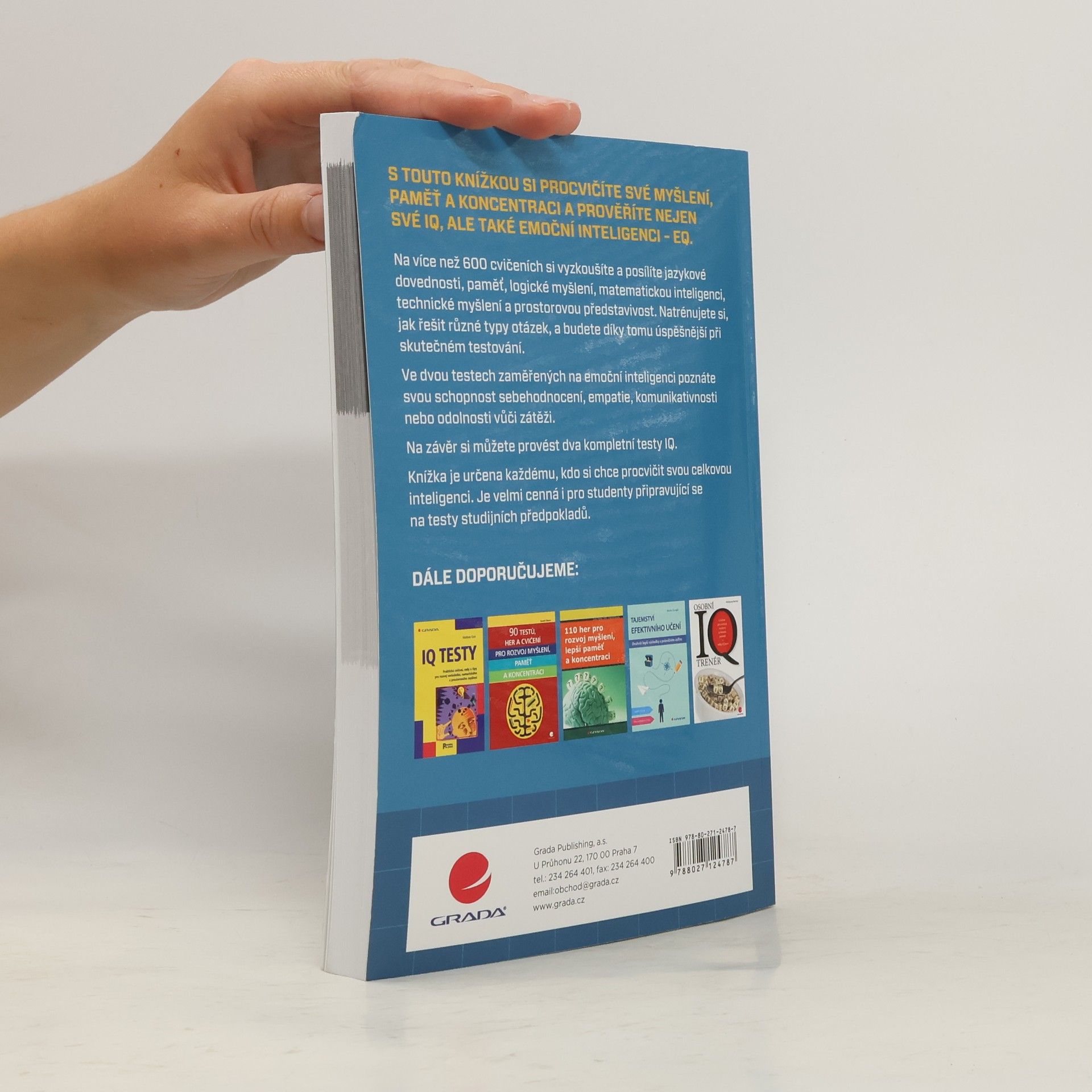 S touto knížkou si procvičíte své myšlení a zlepšíte nejen své IQ, ale také svou emoční inteligenci, tzv. EQ. Na více než 600 cvičeních si vyzkoušíte a posílíte jazykové dovednosti, paměť, logické a matematické myšlení a prostorové vnímání. Natrénujete si také, jak řešit různé typy otázek, a budete díky tomu úspěšnější při skutečném testování. Druhá část knížky nabízí cvičení zaměřené na EQ - od sebehodnocení, motivaci, empatii až po sociální dovednosti. Pomocí jednoduchých testů si rychle zkontrolujete své schopnosti a vlastnosti týkající se emoční inteligence. Na závěr si můžete provést dva komplexní testy IQ a prověřit si tak, co jste se naučili. Knížka je určena všem, kteří chtějí procvičovat svou celkovou inteligenci. Je velmi cenná pro studenty připravující se na testy studijních předpokladů.