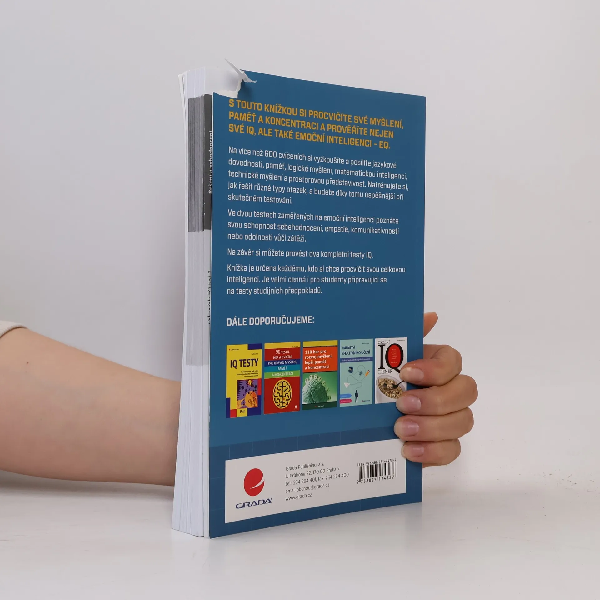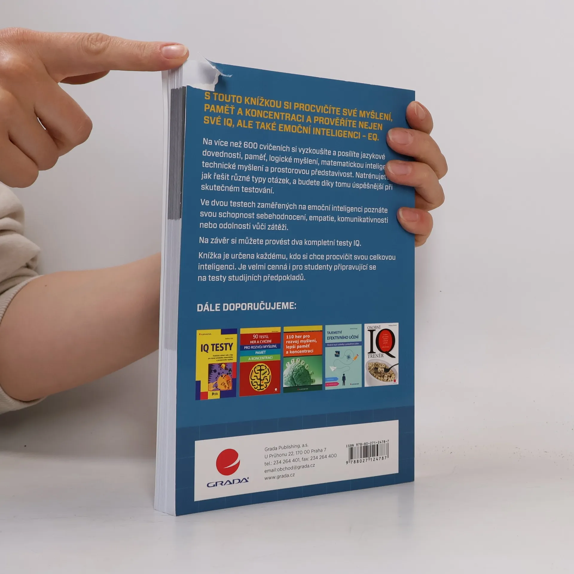 S touto knížkou si procvičíte své myšlení a zlepšíte nejen své IQ, ale také svou emoční inteligenci, tzv. EQ. Na více než 600 cvičeních si vyzkoušíte a posílíte jazykové dovednosti, paměť, logické a matematické myšlení a prostorové vnímání. Natrénujete si také, jak řešit různé typy otázek, a budete díky tomu úspěšnější při skutečném testování. Druhá část knížky nabízí cvičení zaměřené na EQ - od sebehodnocení, motivaci, empatii až po sociální dovednosti. Pomocí jednoduchých testů si rychle zkontrolujete své schopnosti a vlastnosti týkající se emoční inteligence. Na závěr si můžete provést dva komplexní testy IQ a prověřit si tak, co jste se naučili. Knížka je určena všem, kteří chtějí procvičovat svou celkovou inteligenci. Je velmi cenná pro studenty připravující se na testy studijních předpokladů.