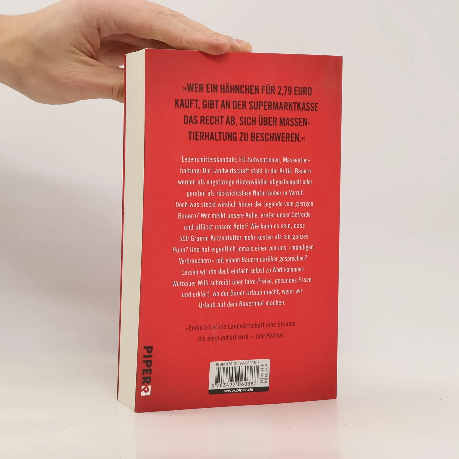 Lebensmittelskandale, EU-Subventionen, Massentierhaltung: Die Landwirtschaft ist in Verruf geraten. Bauern werden als engstirnige Hinterwäldler abgestempelt oder geraten als rücksichtslose Naturräuber in Verruf. Doch was steckt wirklich hinter der Legende vom gierigen Bauern? Wer melkt unsere Kühe, erntet unser Getreide und pflückt unsere Äpfel? Wie kann es sein, dass 500 Gramm Katzenfutter mehr kosten als ein ganzes Huhn? Und hat eigentlich jemals einer von uns »mündigen Verbrauchern« mit einem Bauern darüber gesprochen? Lassen wir ihn doch einfach selbst zu Wort kommen: Wutbauer Willi schreibt über faire Preise, gesundes Essen und erklärt, wo der Bauer Urlaub macht, wenn wir Urlaub auf dem Bauernhof machen.