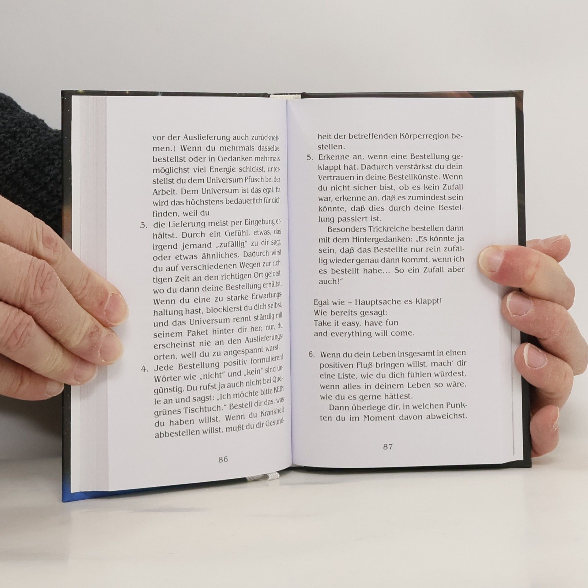 Bestellungen beim Universum ist ein Handbuch zur Wunscherfüllung. Auf einmalig humorvolle und lockere Weise zeigt die Autorin Bärbel Mohr, wie man sich den Traumpartner, den Traumjob oder die Traumwohnung und vieles mehr einfach „herbeidenken“ und quasi beim Universum „bestellen“ kann. Sie bringt dem Leser bei, wie er lernt, auf seine innere Stimme zu hören, wie er sich selbst gegenüber eine stärkere Verpflichtung eingeht und wie er sein Leben positiver gestaltet. Zahlreiche kleine Anekdoten und Parabeln durchziehen das Büchlein, das durch Lebenstips für jeden Tag abgerundet wird. Ein ideales Geschenkbändchen, das einen auf sonnige Gedanken bringt.