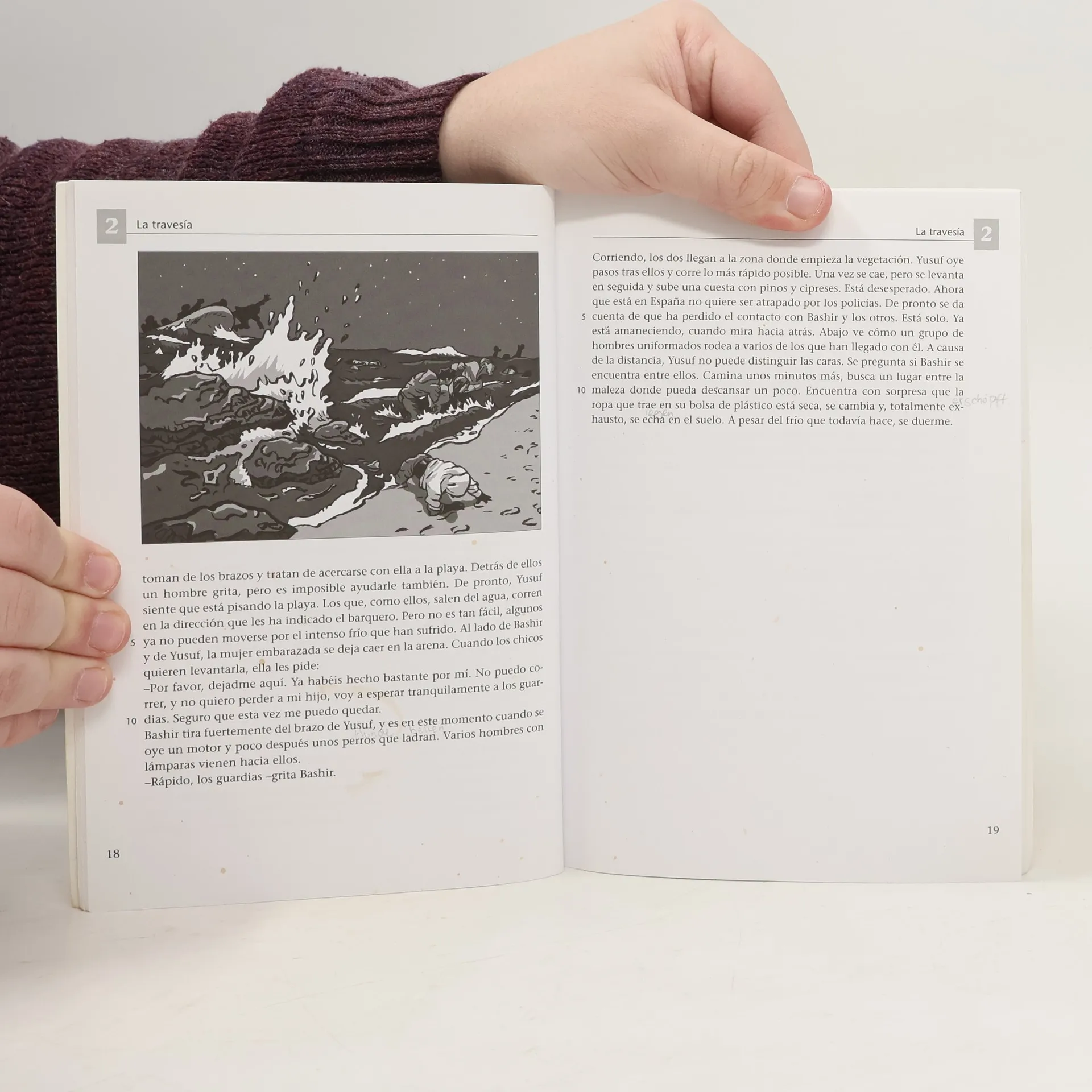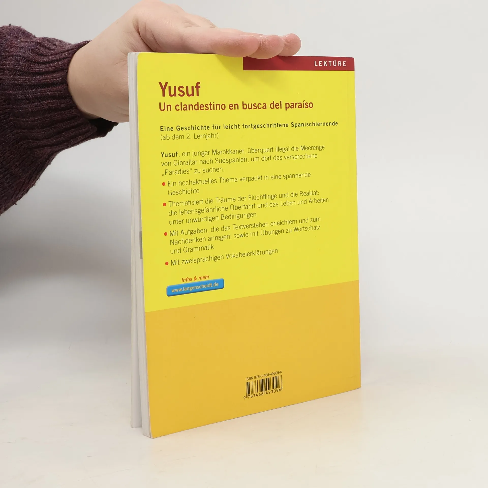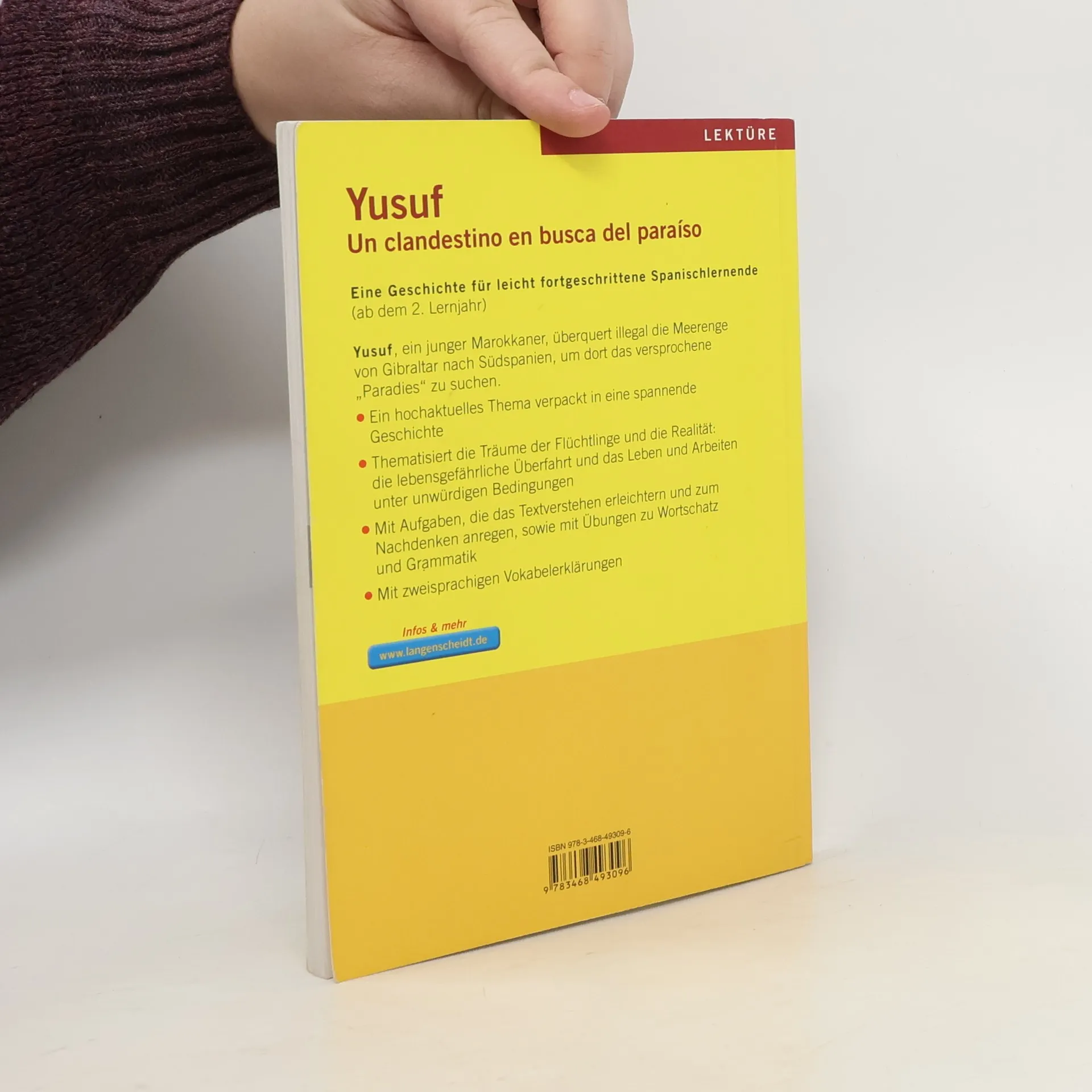 Yusuf, ein junger Marokkaner, überquert illegal die Meerenge von Gibraltar nach Südspanien, um dort das versprochene „Paradies“ zu suchen. Die Lektüre behandelt ein hochaktuelles Thema, bei dem die spannende Geschichte das Interesse trägt. Inklusive Aufgaben zu Textverständnis, Wortschatz und Grammatik sowie zweisprachigen Vokabeleklärungen.