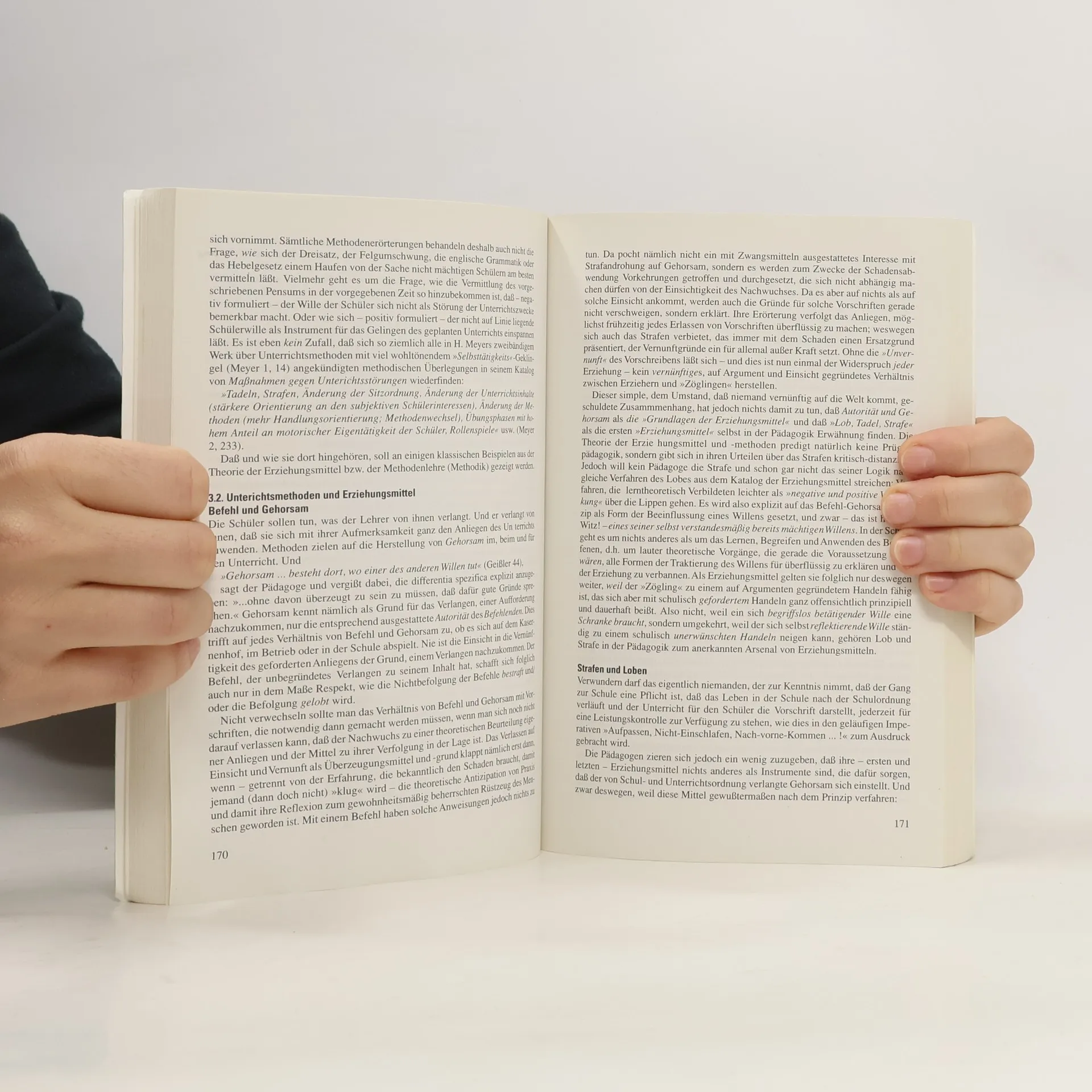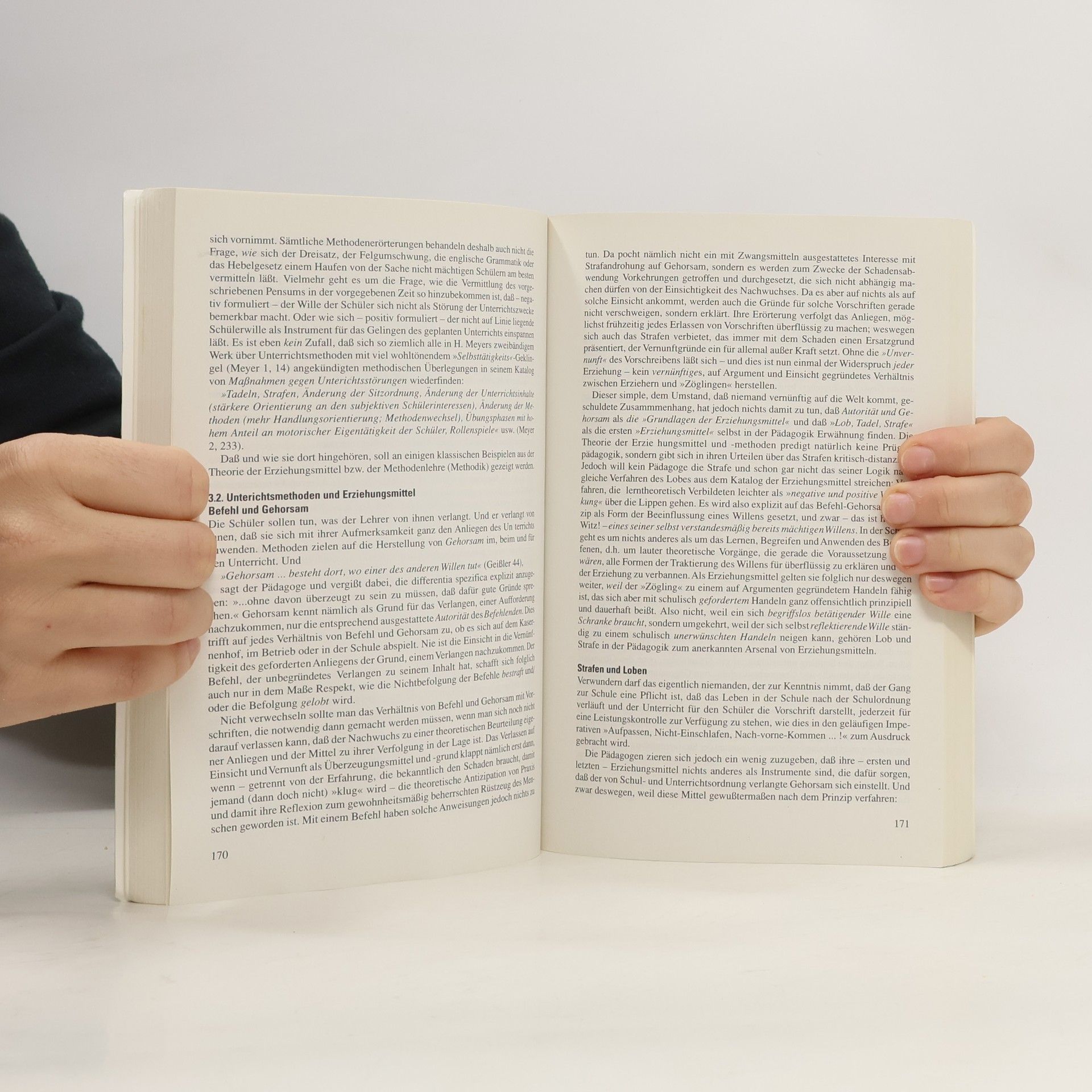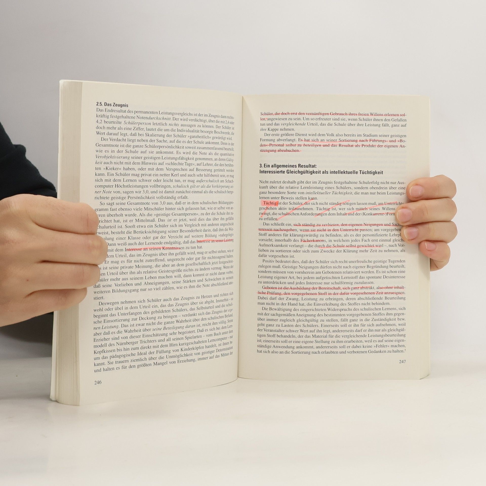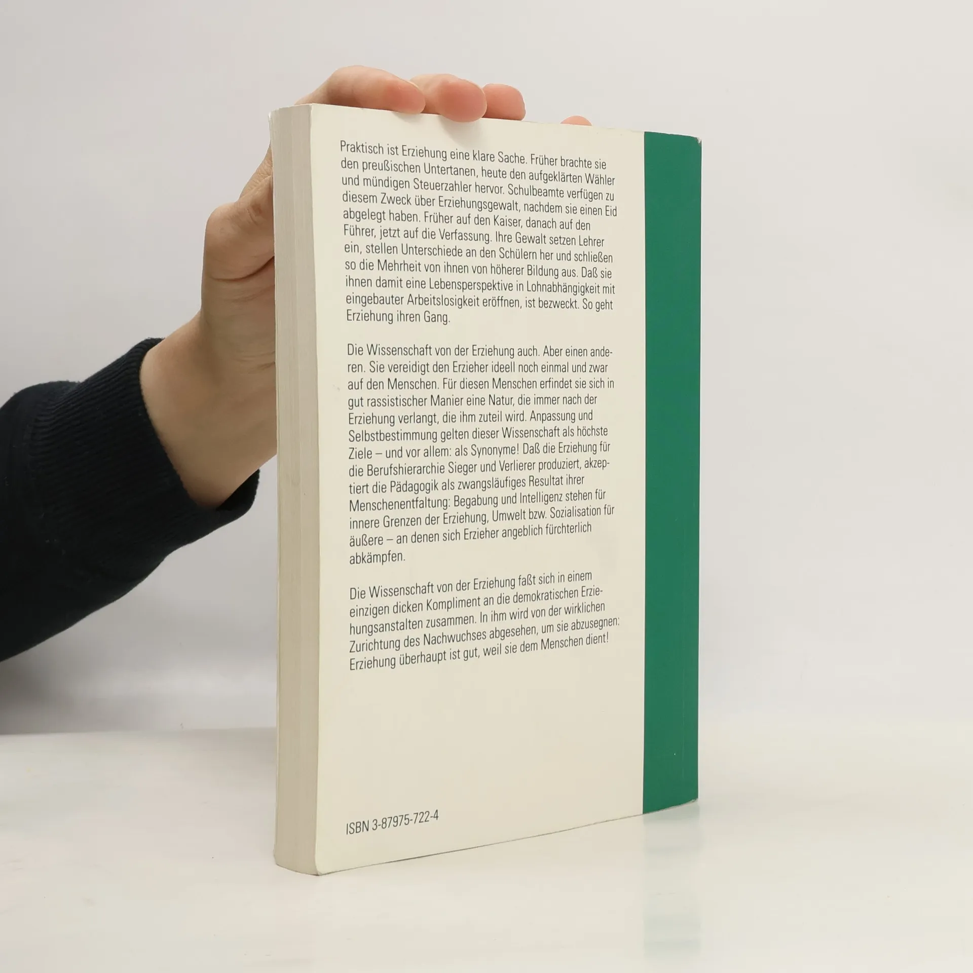 Erziehung wird als klare Angelegenheit betrachtet, die früher den preußischen Untertanen und heute den aufgeklärten Wähler und mündigen Steuerzahler hervorbringt. Schulbeamte, die einen Eid auf die Verfassung abgelegt haben, üben Erziehungsgewalt aus. Lehrer nutzen diese Macht, um Unterschiede unter den Schülern zu schaffen, wodurch die Mehrheit von höherer Bildung ausgeschlossen wird. Dies führt dazu, dass den Schülern eine Lebensperspektive in Lohnabhängigkeit mit eingebauter Arbeitslosigkeit eröffnet wird. Die Wissenschaft von der Erziehung hingegen vereidigt den Erzieher ideell auf den Menschen und konstruiert eine Natur, die stets nach Erziehung verlangt. Anpassung und Selbstbestimmung gelten als höchste Ziele dieser Wissenschaft und werden als Synonyme betrachtet. Die Tatsache, dass Erziehung Sieger und Verlierer in der Berufshierarchie produziert, wird von der Pädagogik als unvermeidliches Ergebnis der Menschenentfaltung akzeptiert. Begabung und Intelligenz repräsentieren innere Grenzen, während Umwelt und Sozialisation äußere darstellen, an denen sich Erzieher angeblich abmühen. Letztlich wird die Wissenschaft von der Erziehung in einem Kompliment an die demokratischen Erziehungsanstalten zusammengefasst, das die tatsächliche Formung des Nachwuchses ignoriert und stattdessen verkündet: Erziehung ist gut, weil sie dem Menschen dient!