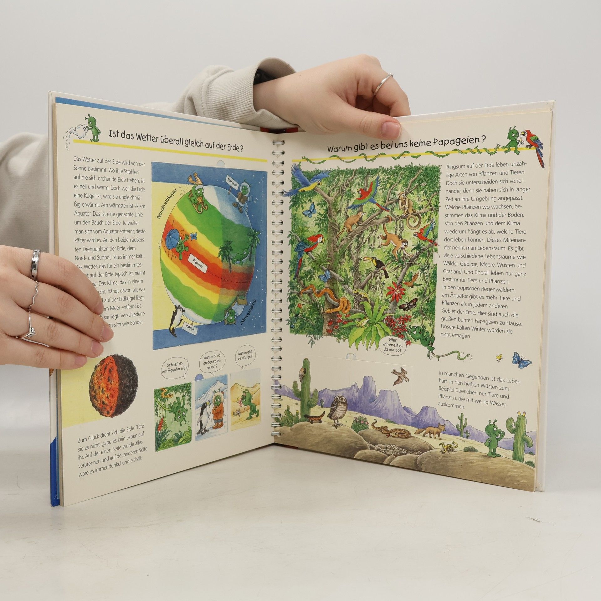 Ein paar Außerirdische in klassischem Grün machen sich an die Frage, wie die Erde entstanden ist, wie die Erdoberfläche gestaltet ist, woher die Berge und Vulkane kommen oder wie das Meer aufgebaut ist, und auch die Erhaltung der Erde ist Thema. In reihenüblicher Aufmachung (vgl. z.B. "Wir entdecken den Weltraum", BA 4/05) wird Kindern ab 5 Wissenswertes über die Erde vermittelt. Wie üblich geben Klappen den Blick auf Verborgenes frei, was für Kinder die Attraktivität des Buches erhöht, wollen sie doch unbedingt herausfinden was dahinter steckt. In klarer und kindgemäßer Sprache werden Zusammenhänge erläutert, begleitet von aussagekräftigen und der Zielgruppe entsprechenden Illustrationen. Das Erdteil-Puzzle am Ende des Buches ist für die Ausleihe nicht geeignet, kann aber entfernt werden, ohne dass der Wert des Buches gemindert wird. Inhaltlich vergleichbar mit "Die Erde" im Loewe-Verlag (BA 5/03), "Unser Planet Erde" von Arena (BA 5/03) wendet sich an etwas Ältere und bietet inhaltlich mehr. Gern empfohlen.. - Reich illustriert und mithilfe von Klappen werden wichtige Kinderfragen zu unserem Planeten beantwortet. Ab 5.