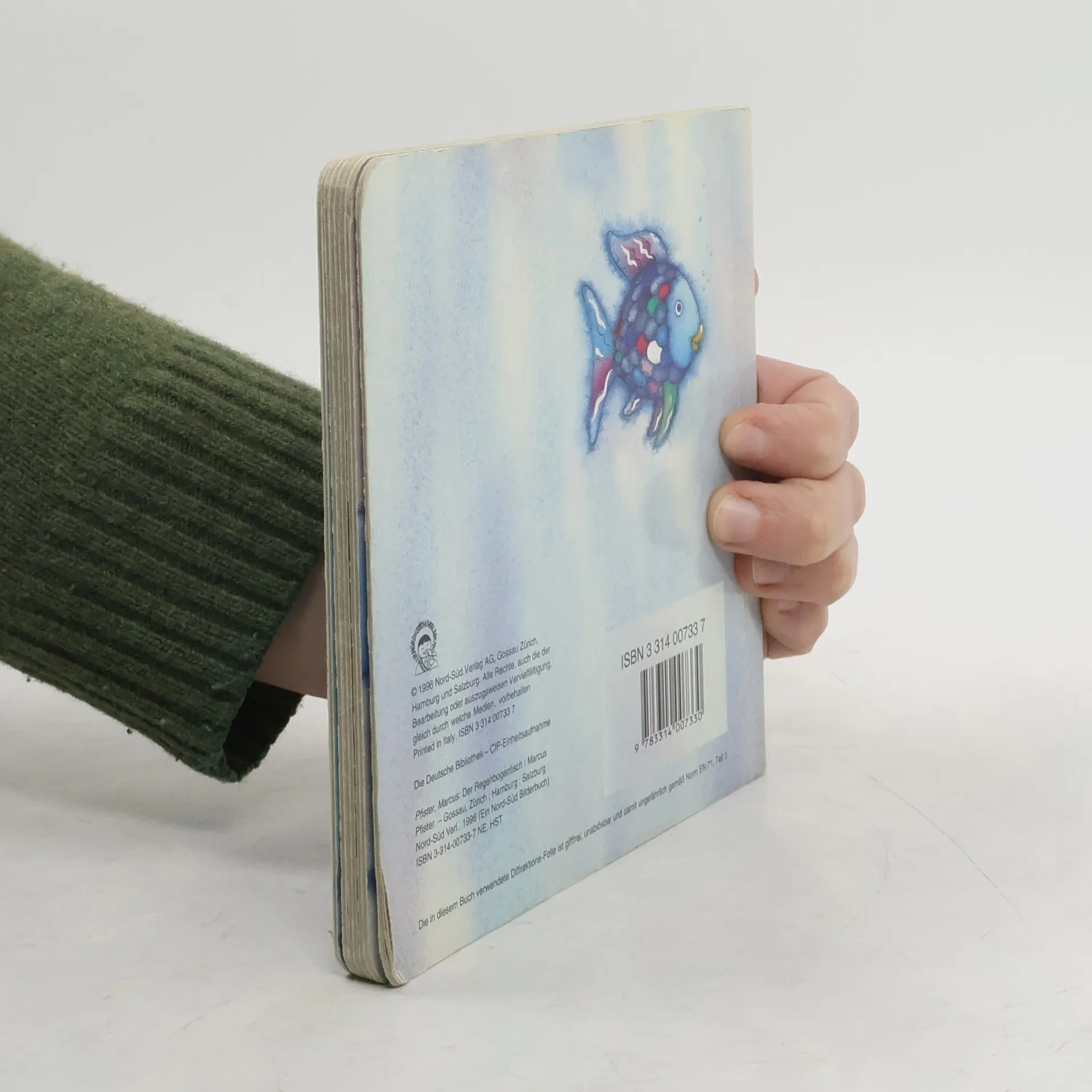 Der Erfolgstitel von 1992 (BA 1/93), der einen weiteren Band nach sich zog ("Regenbogenfisch komm hilf mir!", BA 11/95), auch in einer Riesenausgabe lieferbar, hat noch eine Schwester bekommen: eine Pappausgabe in kleinem Format, die Zahl der Bilder auf die Hälfte reduziert, der Text drastisch gekürzt, z.T. umformuliert und in die Gegenwart gebracht. Knapp wird nun das Wesentliche berichtet: der Regenbogenfisch ist zu stolz zum Teilen und vereinsamt. Erst als er von seinen glitzernden Schuppen abgibt, wird er glücklich. Die wesentlichen Teile der Bilder wurden nur um ein Drittel verkleinert, auch die eingeprägten Schuppen aus Diffraktionsfolie fehlen nicht, dafür wurden Randbeispiele abgeschnitten. Natürlich vermitteln die grossen Bilder mehr Weite, als stärkeren Eingriff empfinde ich den neuen Text. Der märchenhafte Klang, der gut zu den Illustrationen passte, fehlt. 4jährige brauchen keine Pappbände mehr. Für Bibliotheken würde ich trotz des stolzen Preises von inzwischen DM 29,80 die Originalausgabe vorziehen