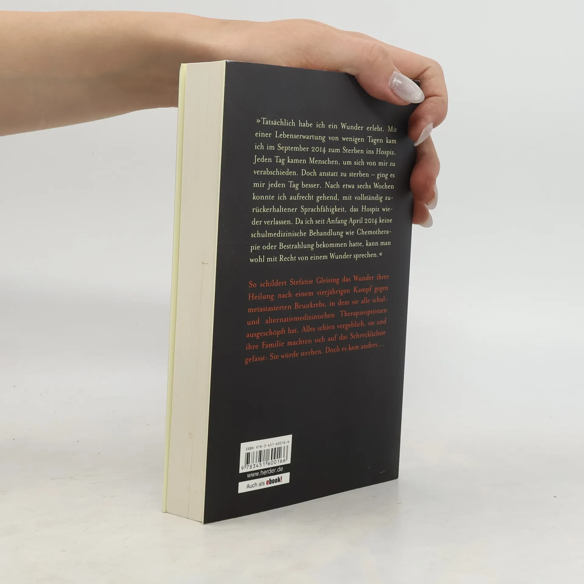 »Tatsächlich habe ich ein Wunder erlebt. Mit einer Lebenserwartung von wenigen Wochen kam ich im September 2014 zum Sterben ins Hospiz. Jeden Tag kamen Menschen, um sich von mir zu verabschieden. Doch anstatt zu sterben – ging es mir jeden Tag besser. Nach etwa sechs Wochen konnte ich aufrecht gehend, mit vollständig zurückerhaltener Sprachfähigkeit, das Hospiz wieder verlassen. Da ich seit Anfang April 2014 keine schulmedizinische Behandlung, wie Chemotherapie oder Bestrahlung, bekommen hatte, kann man wohl mit Recht von einem Wunder sprechen.« So schildert Stefanie Gleising das Wunder ihrer Heilung nach einem vierjährigen Kampf gegen den Brustkrebs, in dem sie alle schul- und alternativmediziischen Therapieoptionen ausgeschöpft hat. Alles schien vergeblich, sie und ihre Familie machten sich auf das Schreckliche gefasst: Sie würde sterben. Doch es kam anders ...