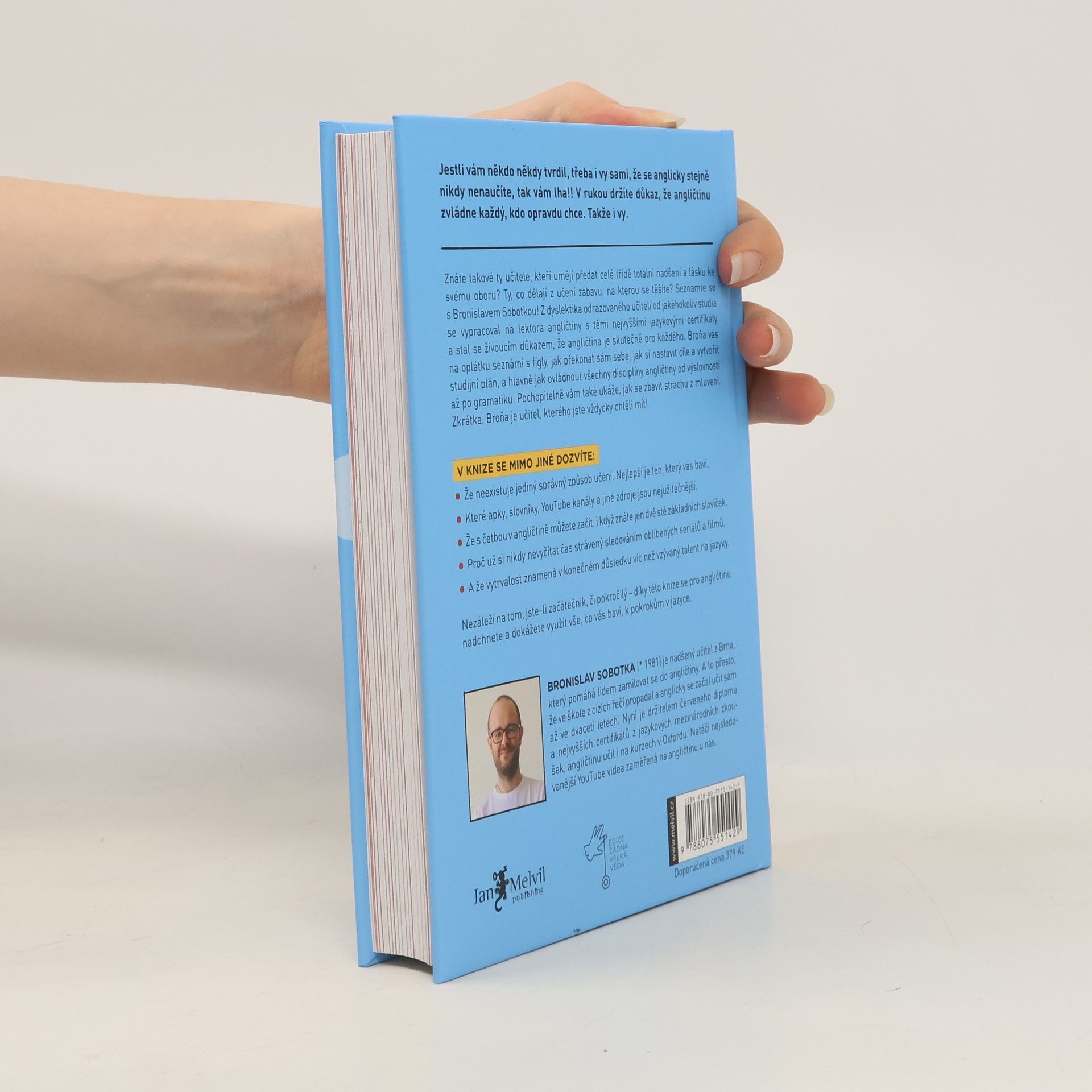 Hello my dear future readers! Jsem Broňa, nadšený učitel angličtiny z Brna, který pomáhá lidem zamilovat se do angličtiny a rád bych vám představil svoji novou knihu. Možná vás to překvapí, ale od malička jsem nesnášel školu. Asi proto, že mi vůbec nešla. Zvláště pak jazyky. Každý diktát za 5. Návrh na přestup do zvláštní školy. Dyslexie. Osm let němčiny a v hlavě prázdno. V 18 nastupuji jako dělník do fabriky a mám radost, že se už nemusím nic učit. End of the story. A víte co? Nakonec jsem vystudoval angličtinu na vysoké, s červeným diplomem, udělal si certifikát CPE a dal ho na Pass A, což je ta nejvyšší úroveň angličtiny, kterou v Cambridge měří. V létě jsem pak několik let po sobě učil angličtinu v Oxfordu a v Londýně jsem získal nejvyšší neuniverzitní globálně uznávanou kvalifikaci pro vyučující anglického jazyka DELTA. Učím jako externista na Masarykově univerzitě, školím učitele a mám největší YouTube kanál v ČR zaměřený na angličtinu, stejně jako nejstudovanější online kurz angličtiny u nás.