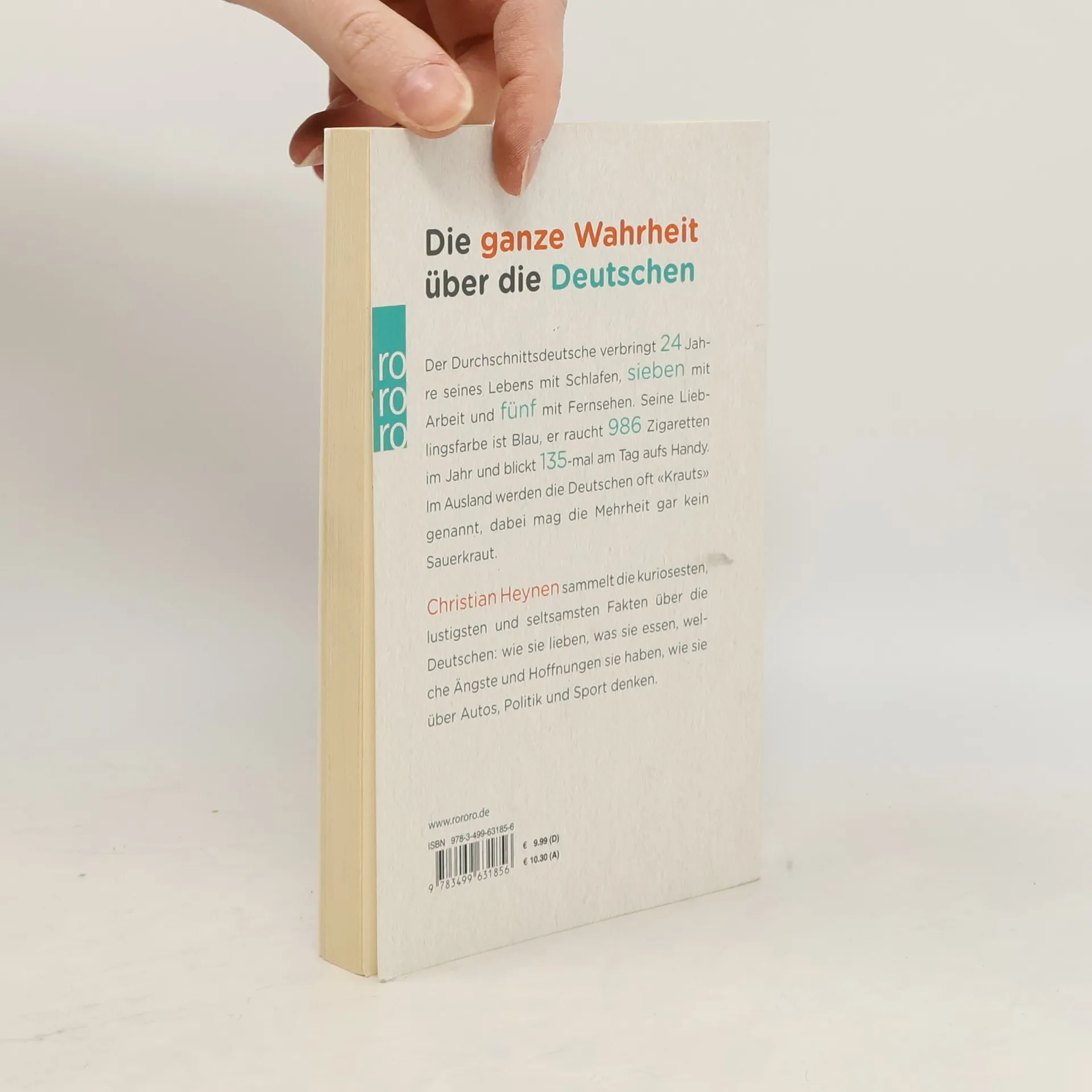 Christian Heynen sammelt die kuriosesten, lustigsten und seltsamsten Fakten über die Deutschen: wie sie lieben, was sie essen, welche Ängste und Hoffnungen sie haben, wie sie über Autos, Politik und Sport denken. Der Durchschnittsdeutsche verbringt 24 Jahre seines Lebens mit Schlafen, sieben mit Arbeit und fünf Jahre mit Fernsehen. Seine Lieblingsfarbe ist Blau, er raucht 986 Zigaretten im Jahr und blickt 135-mal am Tag aufs Handy. Im Ausland werden die Deutschen oft «Krauts» genannt, dabei mag die Mehrheit gar kein Sauerkraut. Dieses Buch präsentiert die ganze Wahrheit über die Deutschen.
