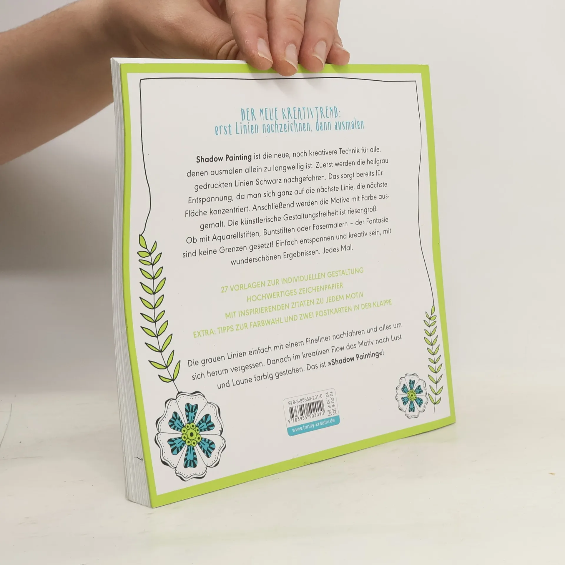 Für alle Freunde von Ausmalbüchern, die aber noch etwas mehr wollen: Shadow Painting ist die neue, kreative Art zu zeichnen – und auszumalen! So können Körper, Geist und Seele richtig entspannen. Und so funktioniert es: Einfach die blass gedruckten Katzen- und Blumenmuster mit einem dunklen Fineliner nachfahren, dabei entspannen und ein wunderschönes schwarz-weiß Bild erhalten. Nun kann die fertige Vorlage auch noch nach Lust und Laune koloriert werden