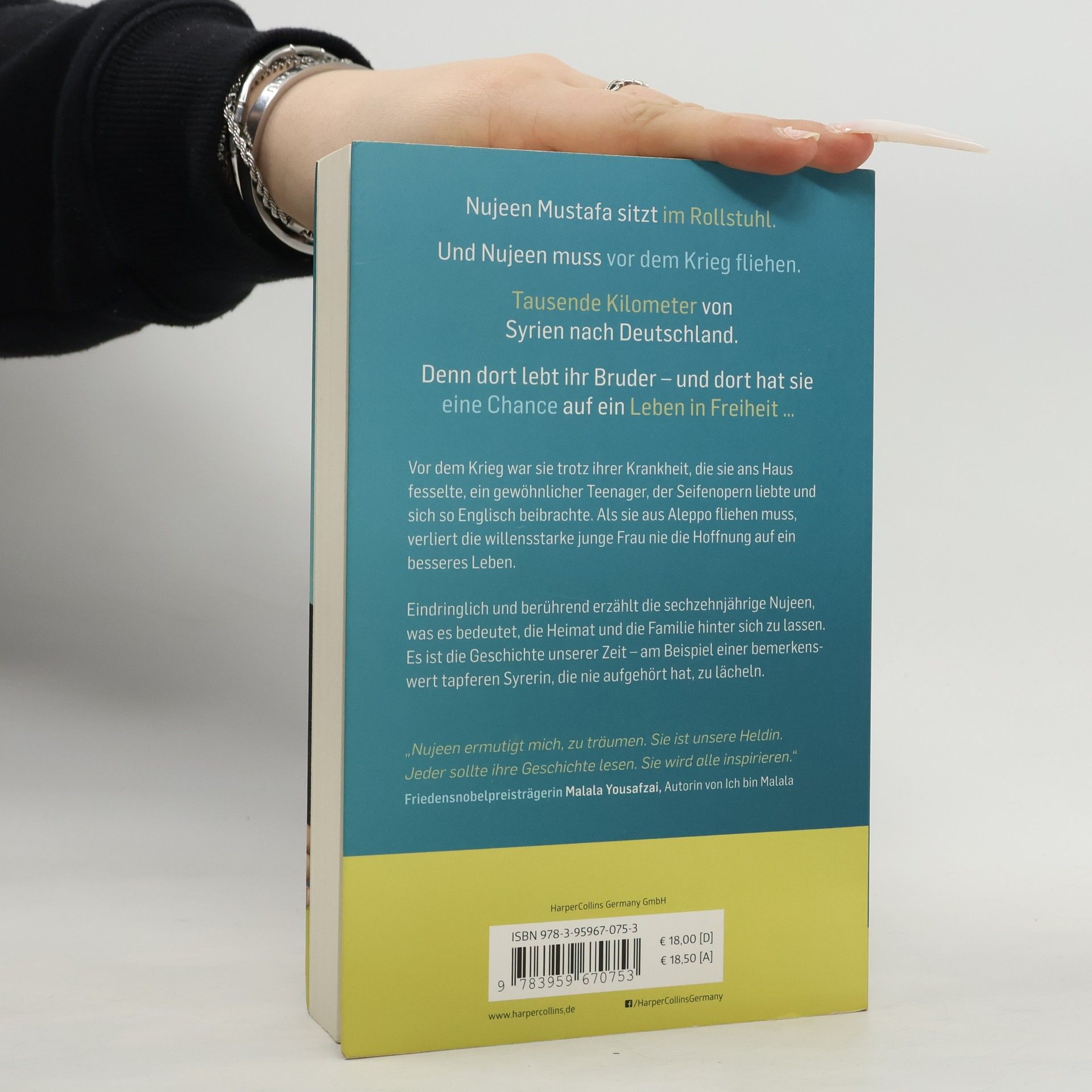 Was bedeutet es wirklich, ein Flüchtling zu sein, durch den Krieg frühzeitig erwachsen werden zu müssen, die geliebte Heimat hinter sich zu lassen und vom Wohlwollen anderer abhängig zu sein? Die sechzehnjährige Nujeen erzählt, wie der syrische Krieg eine stolze Nation zerstört, Familien auseinander reißt und Menschen zur Flucht zwingt. In Nujeens Fall zu einer Reise durch neun Länder, in einem Rollstuhl. Doch es ist auch die Geschichte einer willensstarken jungen Frau, die in Aleppo durch eine Krankheit ans Haus gefesselt ist und sich mit amerikanischen Seifenopern Englisch beibringt, weil sie die starke Hoffnung auf ein besseres Leben hat. Eine Hoffnung, die sich nun vielleicht fern der Heimat in Deutschland erfüllen kann. Es ist die Geschichte von Flucht, dem Verlust der Heimat, die Geschichte unserer Zeit - erzählt von einer bemerkenswert tapferen Syrerin, die nie aufgehört hat, zu lächeln. „Wer würde dieses Mädchen nicht in seinem Land haben wollen?“ US TV-Moderator John Oliver über Nujeen