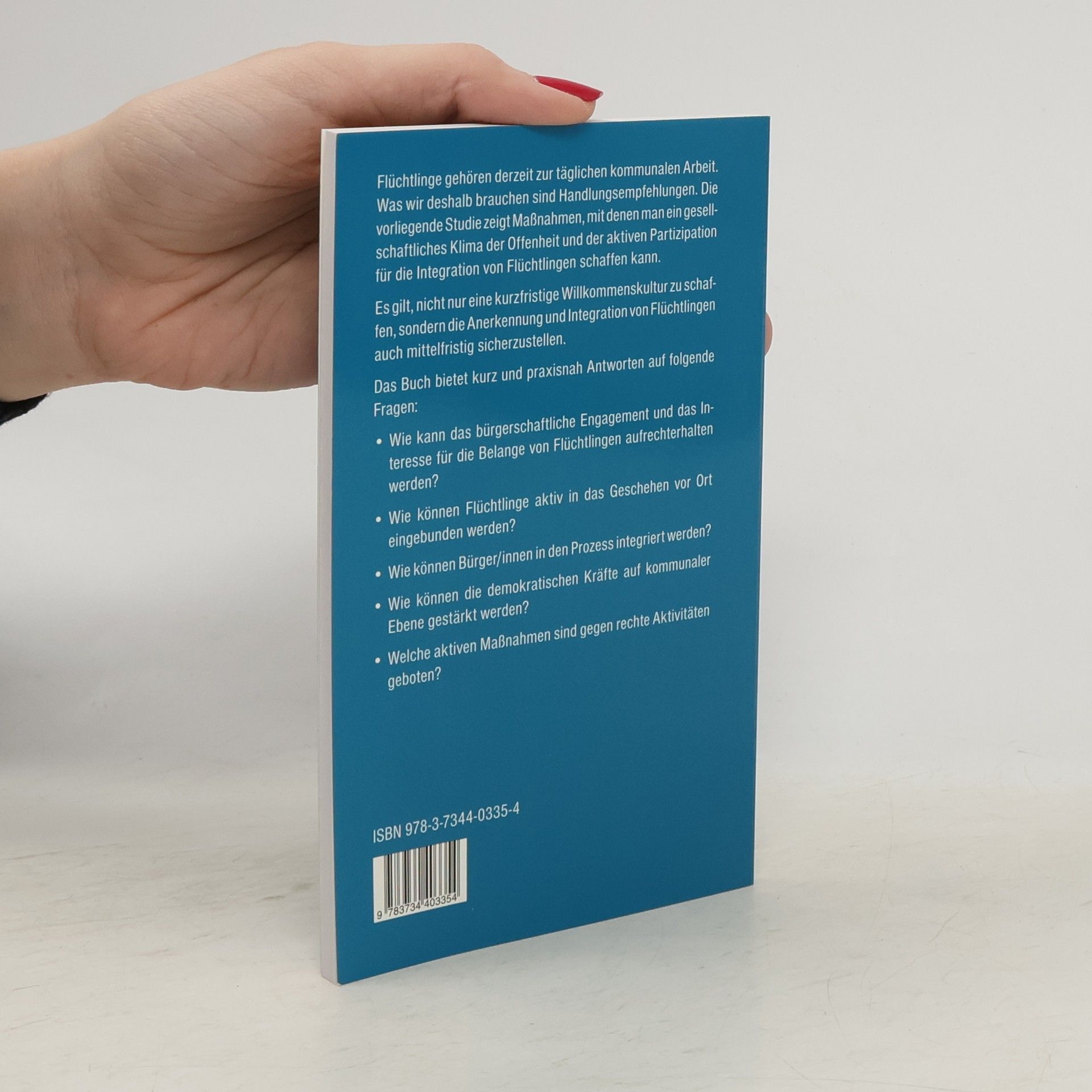 Flüchtlinge gehören derzeit zur täglichen kommunalen Arbeit. Was wir deshalb brauchen sind Handlungsempfehlungen. Die vorliegende Studie zeigt Maßnahmen, mit denen man ein gesellschaftliches Klima der Offenheit und der aktiven Partizipation für die Integration von Flüchtlingen schaffen kann. Es gilt, nicht nur eine kurzfristige Willkommenskultur zu schaffen, sondern die Anerkennung und Integration von Flüchtlingen auch mittelfristig sicherzustellen. Das Buch bietet kurz und praxisnah Antworten auf folgende Fragen: • Wie kann das bürgerschaftliche Engagement und das Interesse für die Belange von Flüchtlingen aufrechterhalten werden? • Wie können Flüchtlinge aktiv in das Geschehen vor Ort eingebunden werden? • Wie können Bürger/innen in den Prozess integriert werden? • Wie können die demokratischen Kräfte auf kommunaler Ebene gestärkt werden? • Welche aktiven Maßnahmen sind gegen rechte Aktivitäten geboten? Das Buch bietet auf wenigen Seiten sehr viele Antworten, wie Integration von Flüchtlingen gelingen kann.
