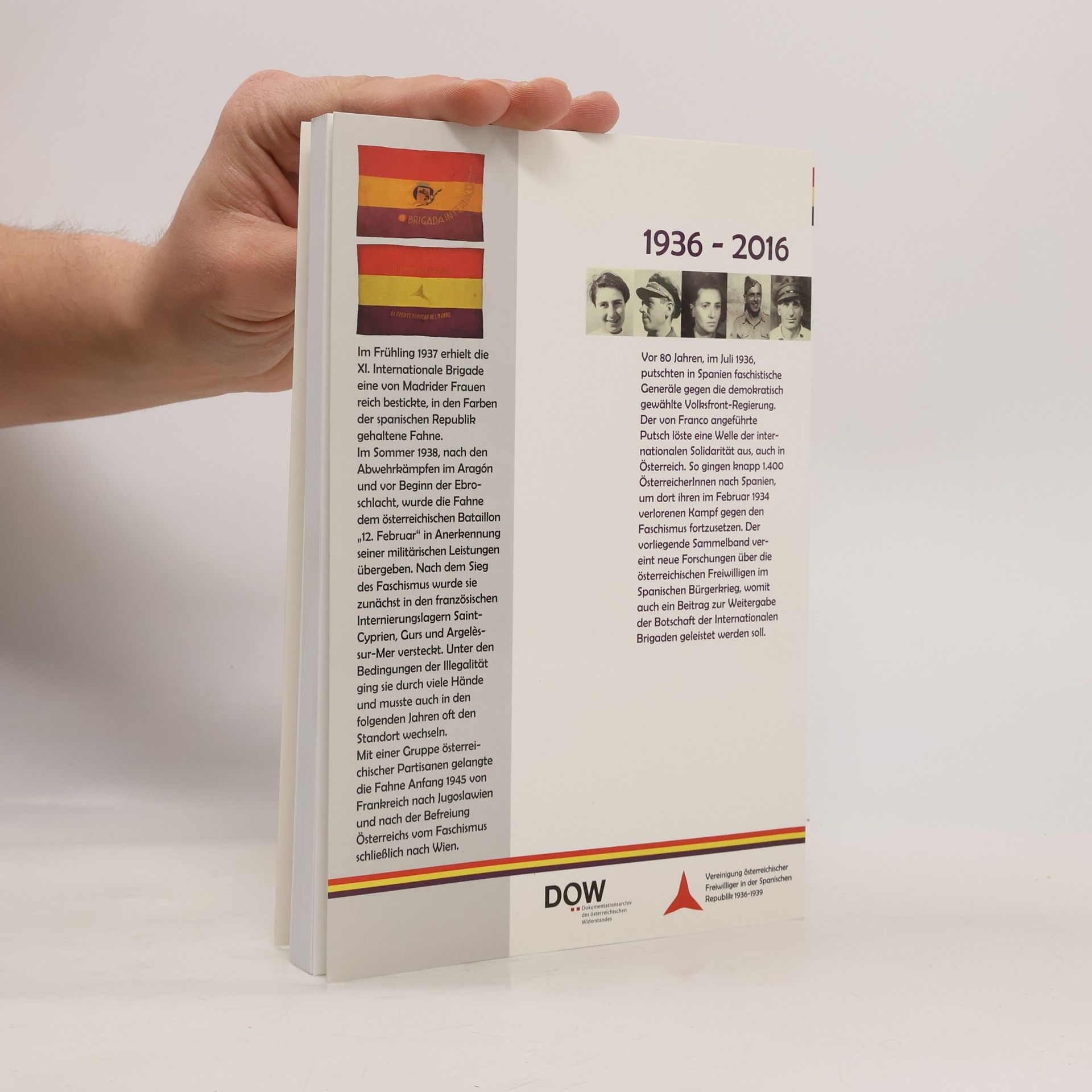 Im Juli 1936 putschten in Spanien faschistische Generäle gegen die wenige Monate zuvor demokratisch gewählte Volksfront-Regierung. Der von Franco angeführte Putsch löste eine Welle der internationalen Solidarität aus, auch in Österreich, wo die Parteien der illegalen ArbeiterInnenbewegung für die Spanische Republik eintraten. Knapp 1400 ÖsterreicherInnen gingen nach Spanien, um dort ihren im Februar 1934 verlorenen Kampf gegen den Faschismus fortzusetzen. Im September 1936 wurde die Aufstellung von Internationalen Brigaden beschlossen – ein Beschluss, der ein Monat später in Albacete in die Tat umgesetzt wurde. Im Juni 1937 wurde in deren Reihen eine überwiegend aus Österreichern zusammengesetzte Einheit gebildet: das Bataillon „12. Februar“ der XI. Internationalen Brigade. Anlässlich des 80. Jahrestages der Gründung der Internationalen Brigaden hat das DÖW 2016 einen Sammelband herausgegeben, der neuere Forschungen über die Rolle der österreichischen Freiwilligen im Spanischen Bürgerkrieg vereint. Der Band entstand in Kooperation mit der Vereinigung österreichischer Freiwilliger in der Spanischen Republik 1936–1939 und der Freunde des demokratischen Spanien.
