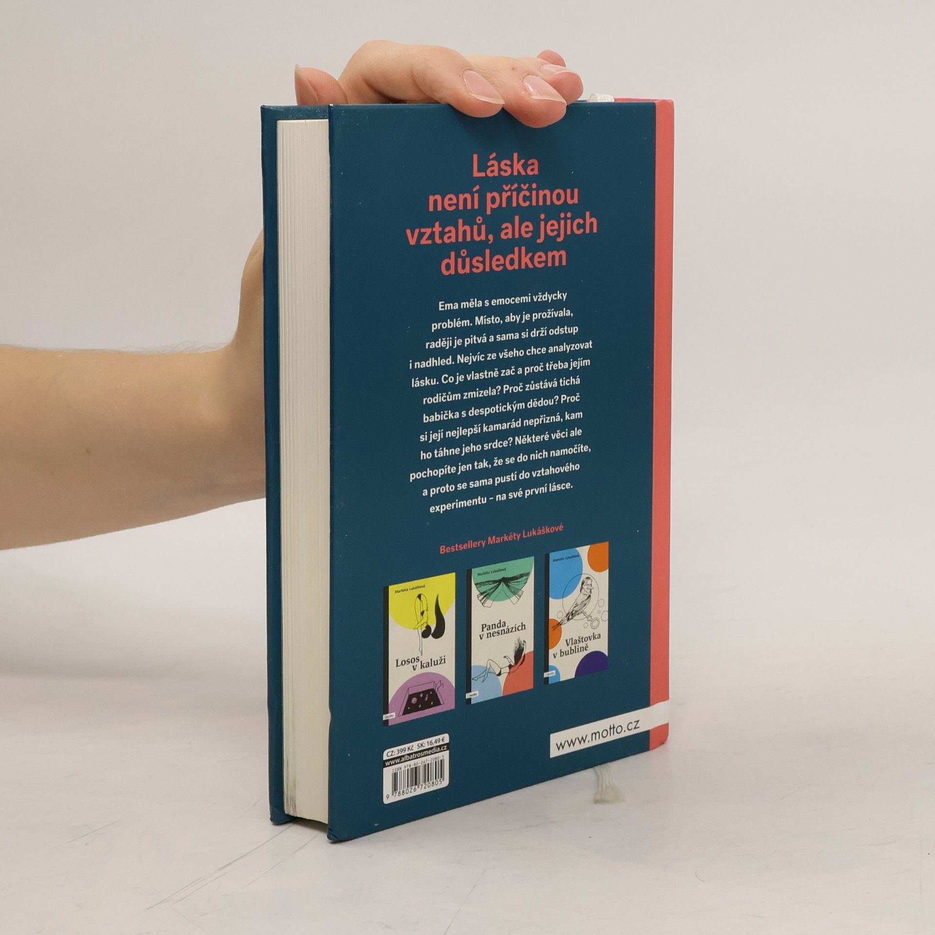 Láska není příčinou vztahů, ale jejich důsledkem Nový samostatný román Markéty Lukáškové. Se svou prvotinou Losos v kaluži objela republiku v rámci divadelního projektu Listování a napsala podle ní scénář, který nyní čeká na filmové zpracování. Po Lososovi následovaly knihy Panda v nesnázích, InTyMně a Vlaštovka v bublině. Skrze své tituly se Markéta snaží šířit osvětu o vnímání psychických problémů. Ema měla s emocemi vždycky problém. Místo, aby je prožívala, raději je pitvá a sama si drží odstup i nadhled. Nejvíc ze všeho chce analyzovat lásku. Co je vlastně zač a proč třeba jejím rodičům zmizela? Proč zůstává tichá babička s despotickým dědou? Proč si její nejlepší kamarád nepřizná, kam ho táhne jeho srdce? Některé věci ale pochopíte jen tak, že se do nich namočíte, a proto se sama pustí do vztahového experimentu – na své první lásce.