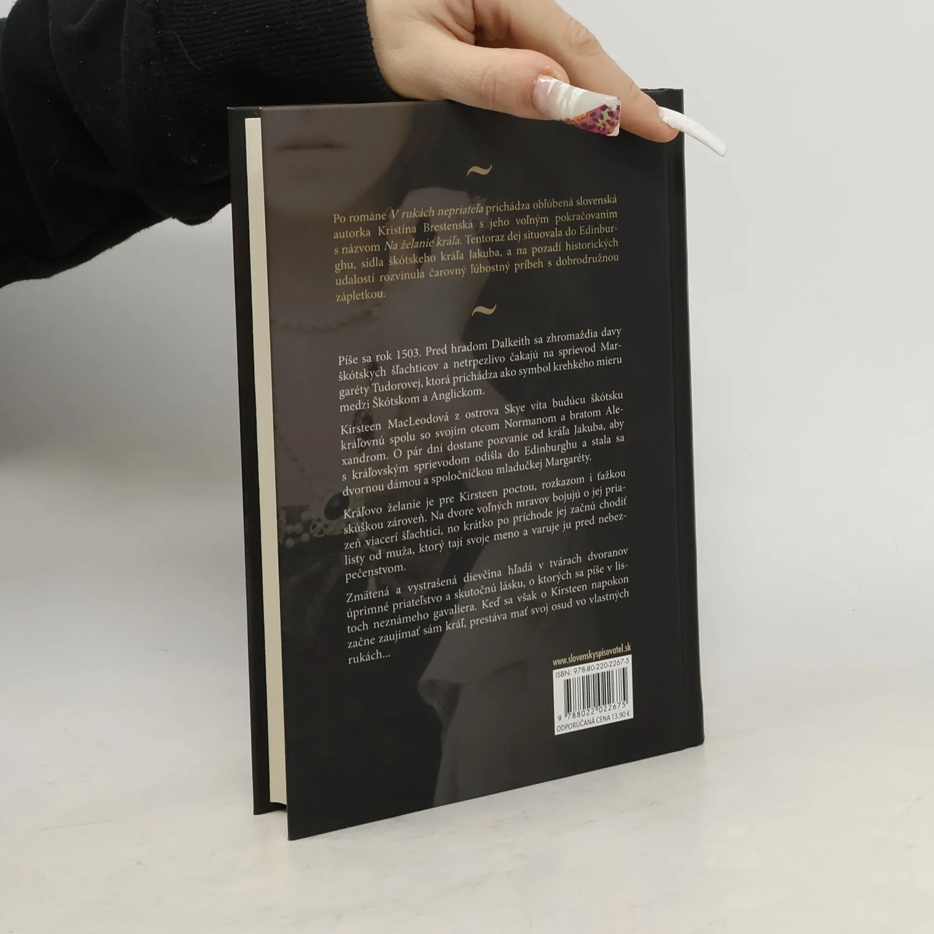 Po románe V rukách nepriateľa prichádza obľúbená slovenská autorka Kristína Brestenská s jeho voľným pokračovaním s názvom Na želanie kráľa. Tentoraz dej situovala do Edinburghu, sídla škótskeho kráľa Jakuba, a na pozadí historických udalostí rozvinula čarovný ľúbostný príbeh s dobrodružnou zápletkou. Píše sa rok 1503. Pred hradom Dalkeith sa zhromaždia davy škótskych šľachticov a netrpezlivo čakajú na sprievod Margaréty Tudorovej, ktorá prichádza ako symbol krehkého mieru medzi Škótskom a Anglickom. Kirsteen MacLeodová z ostrova Skye víta budúcu škótsku kráľovnú spolu so svojím otcom Normanom a bratom Alexandrom. O pár dní dostane pozvanie od kráľa Jakuba, aby s kráľovským sprievodom odišla do Edinburghu a stala sa dvornou dámou a spoločníčkou mladučkej Margaréty. Kráľovo želanie je pre Kirsteen poctou, rozkazom i ťažkou skúškou zároveň. Na dvore voľných mravov bojujú o jej priazeň viacerí šľachtici, no krátko po príchode jej začnú chodiť listy od muža, ktorý tají svoje meno a varuje ju pred nebezpečenstvom. Zmätená a vystrašená dievčina hľadá v tvárach dvoranov úprimné priateľstvo a skutočnú lásku, o ktorých sa píše v listoch neznámeho gavaliera. Keď sa však o Kirsteen napokon začne zaujímať sám kráľ, prestáva mať svoj osud vo vlastných rukách...