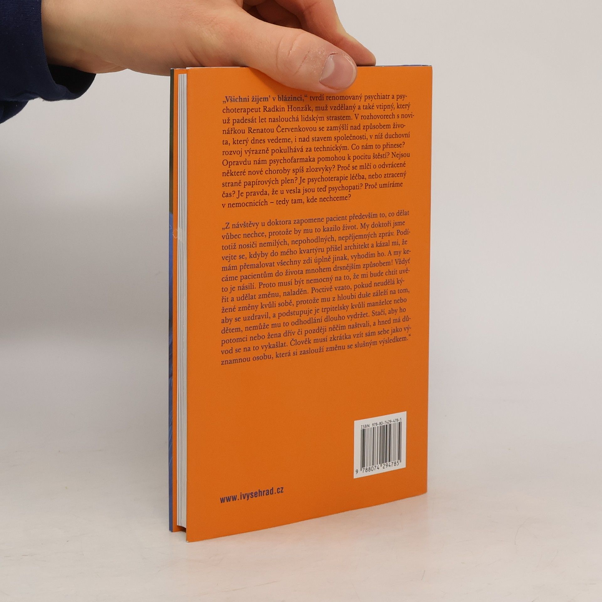 „Všichni žijem’ v blázinci,“ tvrdí renomovaný psychiatr a psychoterapeut Radkin Honzák, který již padesát let naslouchá lidským strastem. V rozhovorech s novinářkou Renatou Červenkovou se zamýšlí nad naším způsobem života a stavem společnosti, v níž duchovní rozvoj zaostává za technickým pokrokem. Jaké to má důsledky? Pomohou nám psychofarmaka k pocitu štěstí? Jsou některé nové choroby spíše zlozvyky? Proč se mlčí o negativních stránkách papírových plen? Je psychoterapie skutečně léčbou, nebo ztraceným časem? A co psychopati u vesla? Proč umíráme v nemocnicích, kde to nechceme? Témata rozhovorů nejsou povzbudivá, ale Radkin Honzák je komentuje s ironií a humorem, přičemž upozorňuje na fenomény dnešní doby, které se „příčí Matce přírodě“ a zajišťují psychiatrům dostatek pacientů i do budoucna. Radkin Honzák (* 1939) po promoci na Fakultě všeobecného lékařství UK v Praze 1962 pracoval jako sekundární lékař v psychiatrické léčebně Kosmonosy a poté jako psychiatr – konzultant v Ústavu pro výzkum výživy a později v IKEM. Dnes je asistentem Ústavu všeobecného lékařství 1. Lékařské fakulty UK, ambulantním psychiatrem IKEM a sekundárním lékařem PL Bohnice.
