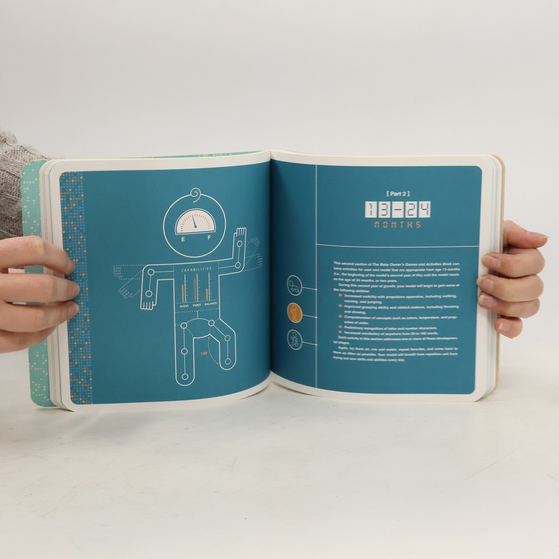 Boost Your Baby’s Brain Power! Babies learn about their world by playing. And with The Baby Owner’s Games and Activities Book , you’ll discover 75 exciting ways to enrich their minds, strengthen their bodies, and spark their imaginations. No expensive toys or battery-operated gizmos are required—just common household materials and a little creativity. From cooking and making crafts to dancing, playing music, and imitating favorite zoo animals, these activities all feature numerous developmental benefits. Compatible with all models ages 0–36 months, The Baby Owner’s Games and Activities Book will result in hours of enjoyment.
