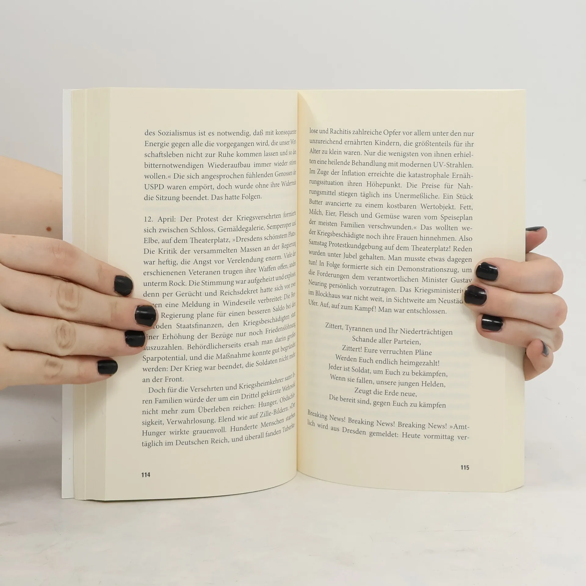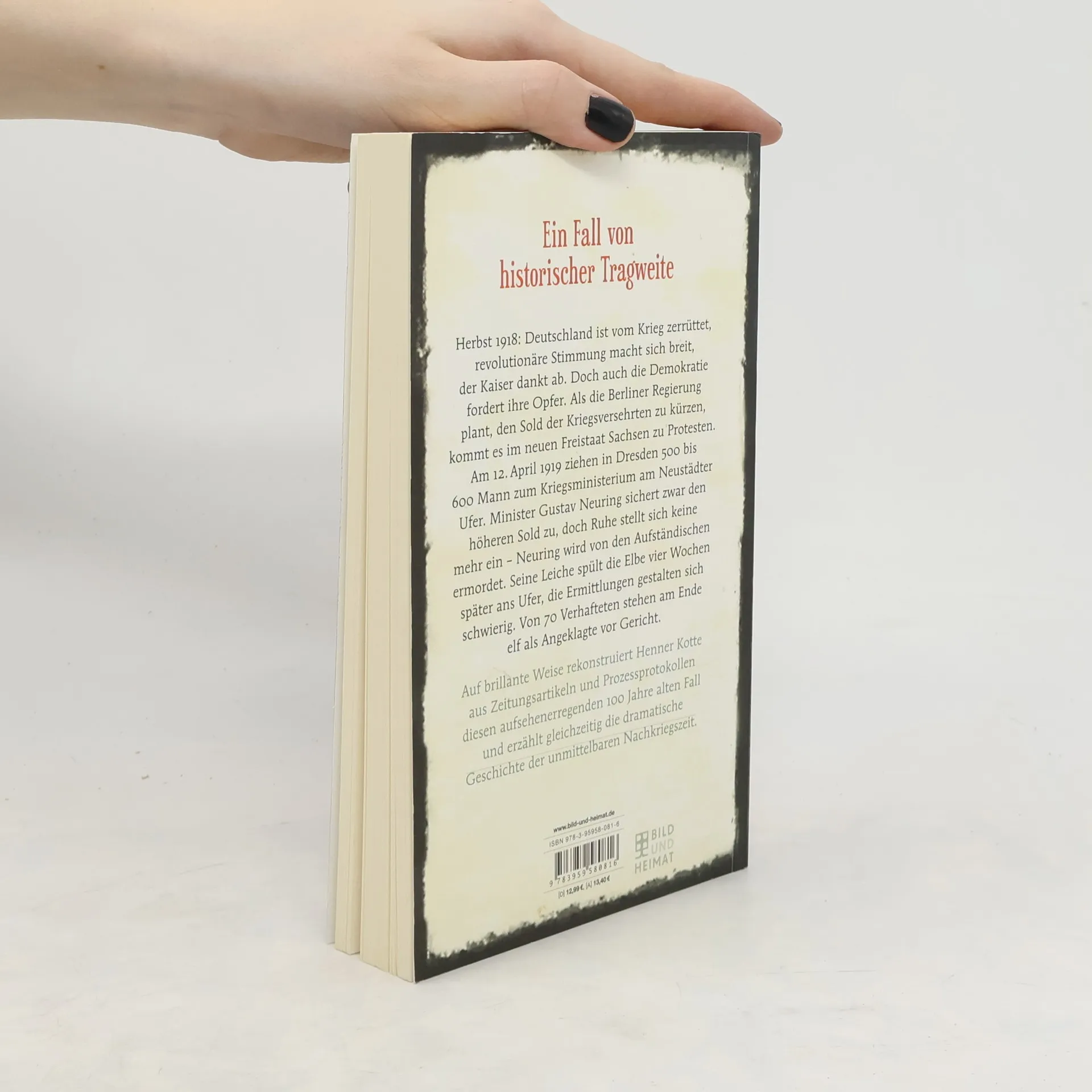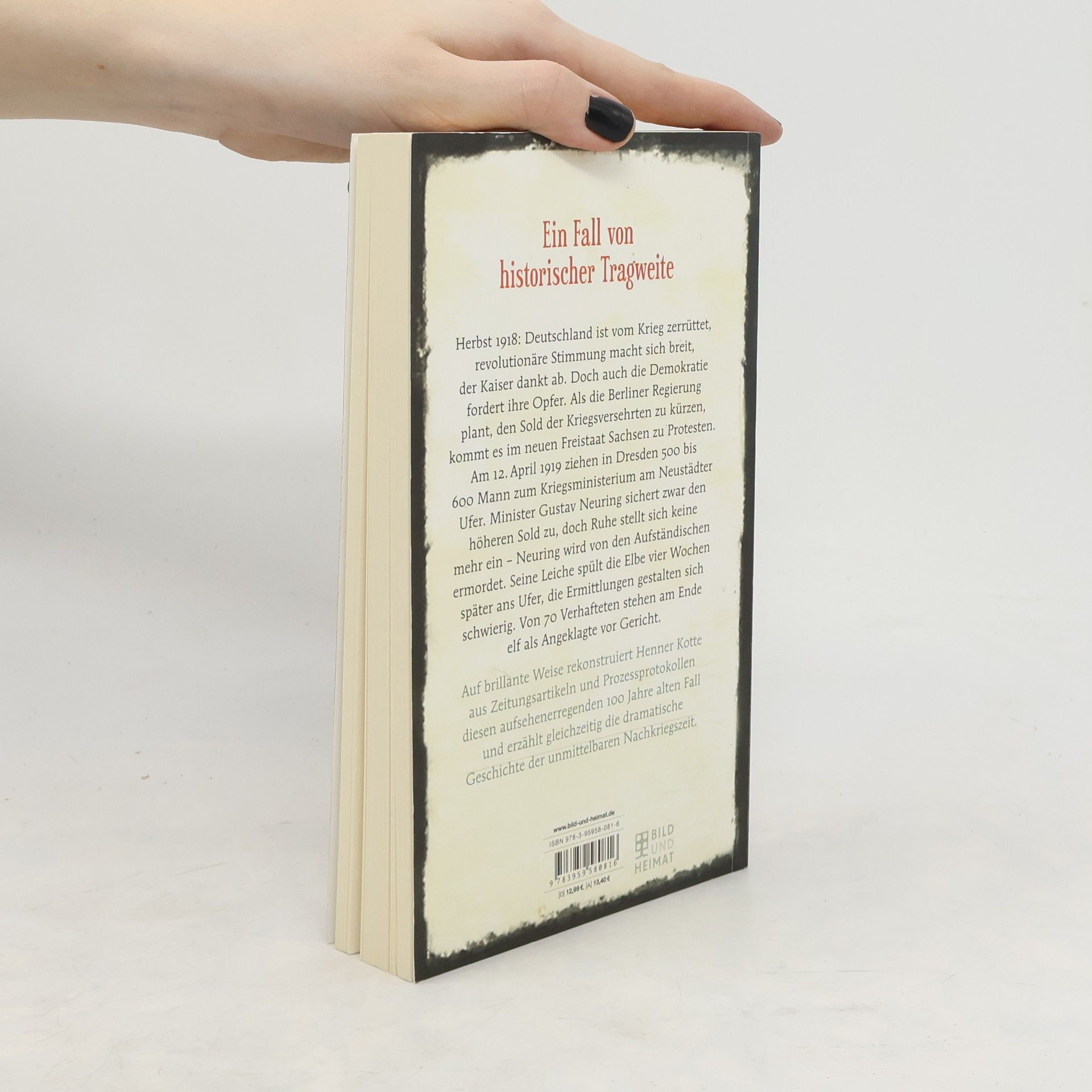 Die Augustusbrücke galt einst als schönste Brücke Europas. An ihrem Neustädter Ufer steht das Blockhaus. Am 12. April 1919 ziehen die Kriegsgeschädigten, 500 bis 600 Mann, zum Kriegsministerium, das sich darin befindet. Kriegsminister Gustav Neuring plant den Sold der Versehrten zu kürzen. Man protestiert, Wachhabende geben Warnschüsse ab. Der Minister sichert nun doch den höheren Sold zu, doch Ruhe stellt sich nicht mehr ein. »Von allen Seiten wurde auf ihn eingeschlagen. Dann nahmen ein paar dieser Gesellen ihn und warfen ihn über die Brücke in die Elbe. Der Minister versuchte zu schwimmen. Nun aber wurde von den wahnwitzig gewordenen Menschen auf ihn geschossen. Ein Kopfschuss traf den Unglücklichen, und er sank sofort unter.« Neurings Leiche spült die Elbe sechs Wochen später ans Ufer. Von den 78 Verhafteten stehen elf als Angeklagte vor Gericht. Ein Urteil erfolgt nicht – zu viele Spitzel des Geheimdienstes sind darunter. Auf brillante Weise nimmt Henner Kotte die Spur der Täter und Ermittler auf und rekonstruiert aus Tatortberichten, Vernehmungsprotokollen und Zeitungsartikeln diesen aufsehenerregenden 100 Jahre alten Fall.
