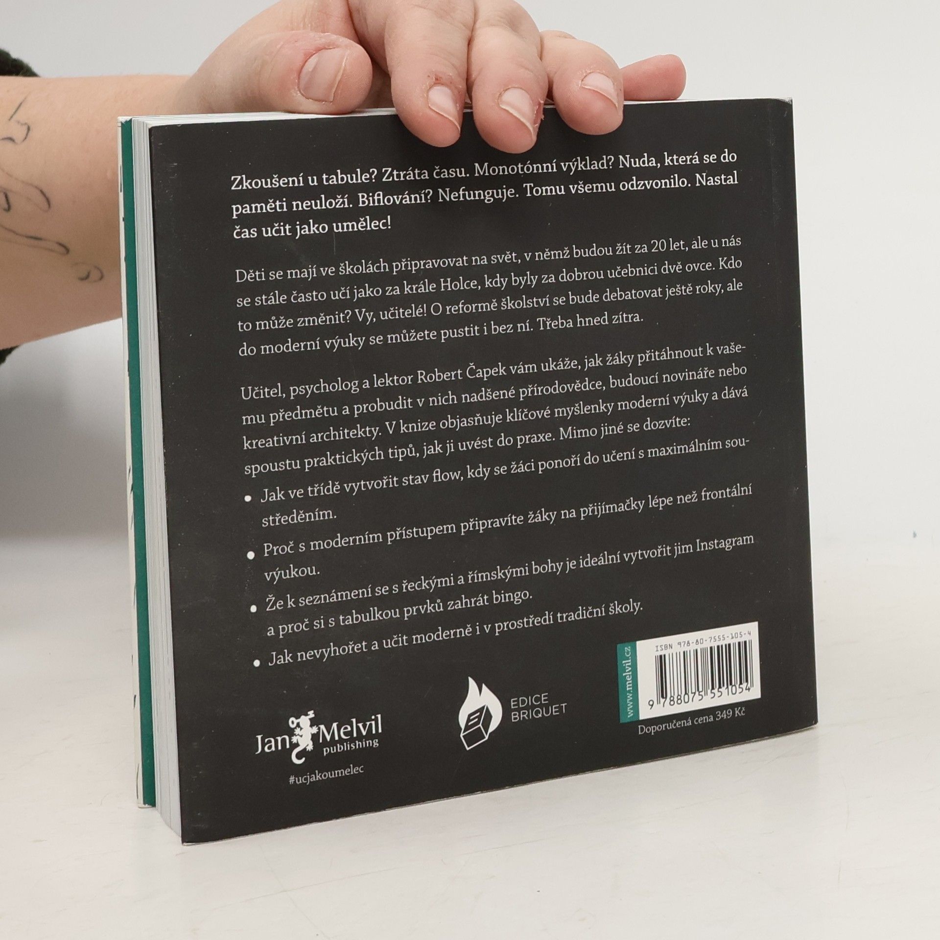 Zkoušení u tabule? Ztráta času. Monotónní výklad? Nuda, která se do paměti neuloží. Biflování? Nefunguje. Tomu všemu odzvonilo. Nastal čas učit jako umělec! Děti se mají ve školách připravovat na svět, v němž budou žít za 20 let, ale u nás se stále často učí jako za krále Holce, kdy byly za dobrou učebnici dvě ovce. Kdo to může změnit? Vy, učitelé! O reformě školství se bude debatovat ještě roky, ale do moderní výuky se můžete pustit i bez ní. Třeba hned zítra. Učitel, psycholog a lektor Robert Čapek vám ukáže, jak žáky přitáhnout k vašemu předmětu a probudit v nich nadšené přírodovědce, budoucí novináře nebo kreativní architekty. V knize objasňuje klíčové myšlenky moderní výuky a dává spoustu praktických tipů, jak ji uvést do praxe. V knize se mimo jiné dozvíte: Jak ve třídě vytvořit stav flow, kdy se žáci ponoří do učení s maximálním soustředěním. Proč s moderním přístupem připravíte žáky na přijímačky lépe než frontální výukou. Že k seznámení se s řeckými a římskými bohy je ideální vytvořit jim Instagram a proč si s tabulkou prvků zahrát bingo. Jak nevyhořet a učit moderně i v prostředí tradiční školy.