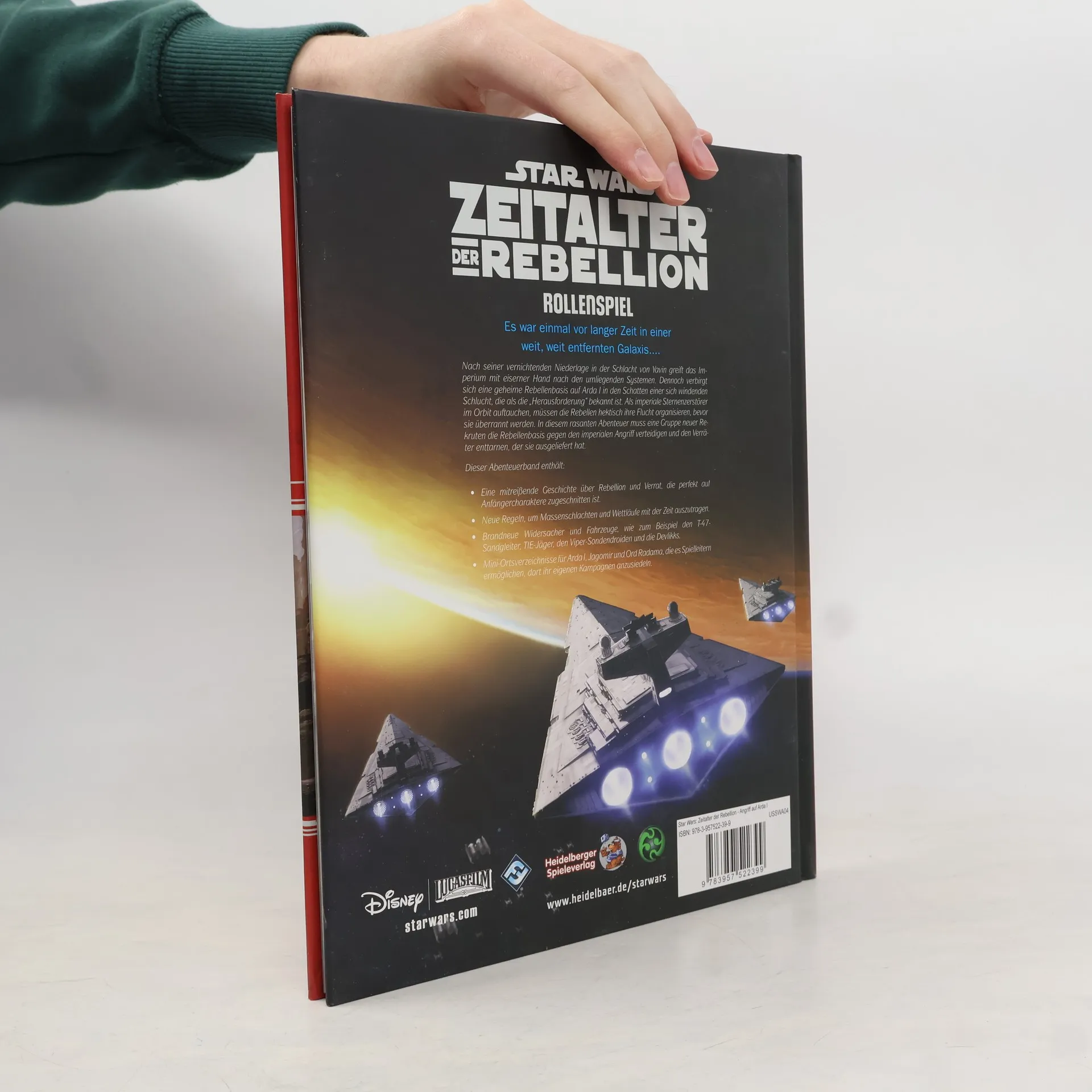 Ansturm auf Arda I ist ein 96-seitiges Abenteuer für das Star Wars: Zeitalter der Rebellion Rollenspiel, das sich mit verzweifelten Auseinandersetzungen, heiklen Allianzen und einem überwältigenden Feind auseinandersetzt. Als Schauplatz dient Arda I, eine geheime Rebellenbasis. Der Band enthält Regeln für den Massenkampf, mit denen Spielleiter große Gefechte zum Leben erwecken können, sowie detaillierte Verzeichnisse der Basis, brandneue Widersacher und Fahrzeugprofile.