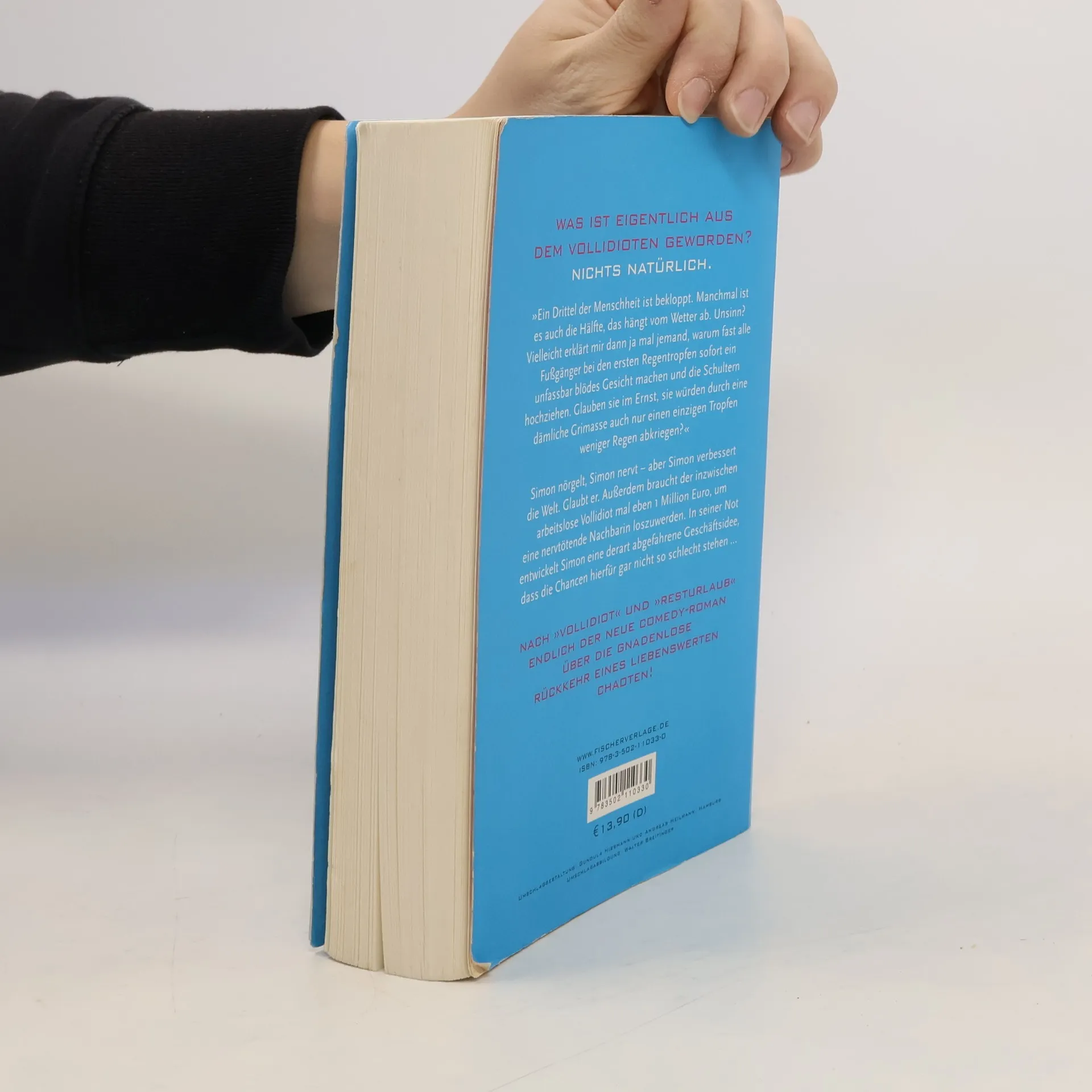 'Ein Drittel der Menschheit ist bekloppt. Manchmal ist es auch die Hälfte, das hängt vom Wetter ab. Unsinn? Vielleicht erklärt mir dann ja mal jemand, warum fast alle Fußgänger bei den ersten Regentropfen sofort ein unfassbar blödes Gesicht machen und die Schultern hochziehen. Glauben sie im Ernst, sie würden durch eine dämliche Grimasse auch nur einen einzigen Tropfen weniger Regen abkriegen? Das ist eine rhetorische Frage mit einer sehr, sehr traurigen Antwort: Sie glauben es.' Simon nörgelt, Simon nervt – aber Simon verbessert die Welt. Glaubt er. Außerdem braucht der inzwischen arbeitslose Vollidiot mal eben 1 Million Euro, um eine nervtötende Nachbarin loszuwerden. In seiner Not entwickelt Simon eine derart abgefahrene Geschäftsidee, dass die Chancen hierfür gar nicht so schlecht stehen. Nach ›Vollidiot‹ und ›Resturlaub‹ endlich der neue Comedy-Roman über die gnadenlose Rückkehr eines liebenswerten Chaoten!