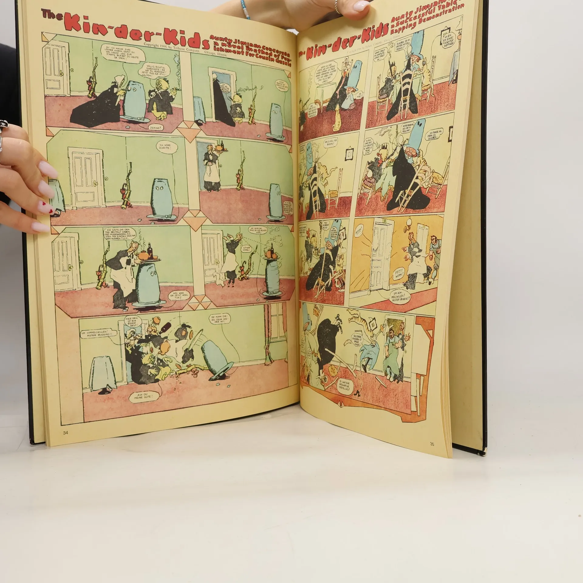 In den Jahren 1906 und 1907 schuf Lyonel Feininger, der später als Maler und Bauhaus-Zeichner weltberühmt wurde, für die Chicago Sunday Tribune mit »The Kinder Kids« und »Wee Willie Winkie‘s World« zwei frühe Meisterwerke der Comic-Kunst. In den großformatigen Bildkompositionen verband Feininger auf eindrucksvolle Weise den anarchistischen Witz amerikanischer Comic- Strips mit der Formensprache der bildenden Kunst. Die Kinder Kids – Daniel Webster, der tüchtige Teddy und Breitmaul sind die Kinder deutscher Auswanderer. Sie leben bei ihrer Tante Jim-Jam in Amerika. Um der täglichen Lebertran-Verabreichung ihrer Tante zu entkommen, schnappen sich die drei ihren Dackel Sherlock Bones sowie den aufziehbaren Japaner Japanski und begeben sich in der Familienbadewanne auf eine aben- teuerliche Verfolgungsreise über die Weltmeere ... wäh- rend ihnen die resolute Jim-Jam und der simple Cousin Gus mit einem Heißluftballon dicht auf den Fersen sind.