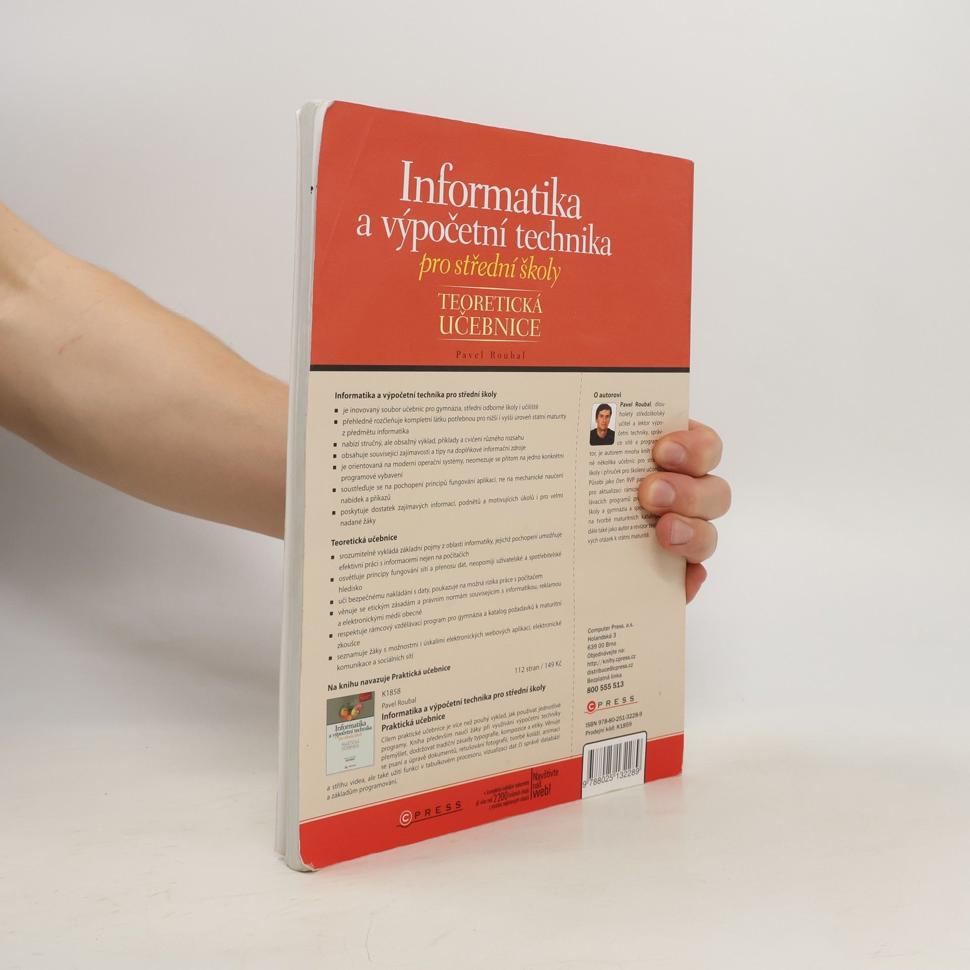 Informatika a výpočetní technika pro střední školy je nový moderní soubor učebnic pro gymnázia, střední odborné školy i učiliště nabízí stručný, ale obsažný výklad, příklady a cvičení různého rozsahu obsahuje související zajímavosti a tipy na doplňkové informační zdroje soustřeďuje se na pochopení principů fungování aplikací, ne na mechanické naučení nabídek a příkazů rozdělením do více dílů lépe umožňuje vlastní výběr probíraných témat Teoretická učebnice srozumitelně vykládá základní pojmy z oblasti informatiky, jejichž pochopení umožňuje efektivní práci s informacemi (nejen) na počítačích blíže se věnuje popisu softwarového i hardwarového vybavení a sítí, neopomíjí uživatelské a spotřebitelské hledisko učí bezpečnému nakládání s daty, poukazuje na možná rizika práce s počítačem stručně seznamuje s principy programování a práce s databázemi respektuje rámcový vzdělávací program pro gymnázia a katalog požadavků k maturitní zkoušce Další díly Praktická učebnice 1 (základy práce s PC, Internet, text a tabulky) Praktická učebnice 2 (grafika a fotografie, tvorba prezentací a webových stránek) Praktická učebnice 3 (práce s databázemi) Praktická učebnice 4 (algoritmizace a programování) Metodická příručka pro praktické učebnice 1 a 2 Metodická příručka pro praktické učebnice 3 a 4 O autorovi: Pavel Roubal je zkušený autor mnoha knih včetně několika učebnic pro střední školy, ale také manuálů pro školení učitelů projektu SIPVZ (úrovně Z a modulu Grafika a digitální fotografie).